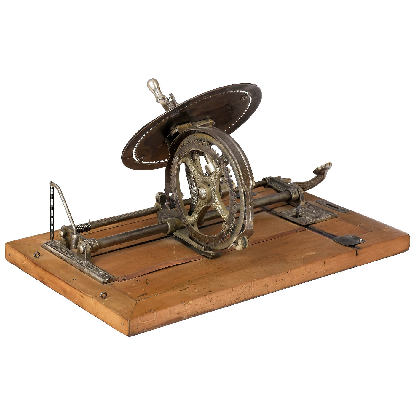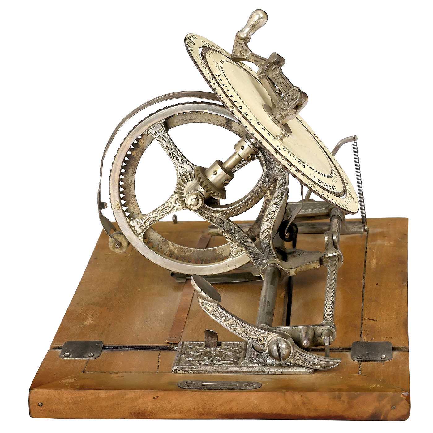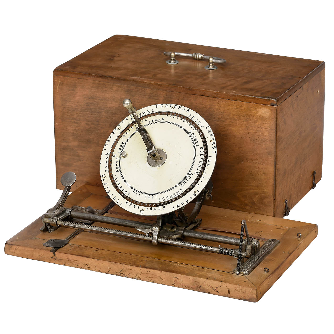 Manufactured by Dr. Friedrich Rehmann, Karlsruhe, Germany; one of the most attractive typewriters ever built. As the name "Secret and World Typewriter" suggests, it is also a cypher machine, with setting pointer and two concentric rings. The inner ring can be loosened and turned for writing encrypted texts, letters, etc.! With wood case. – Literature: Martin, 1949, p. 168. – One of the most important collector's items and most spectacular exhibition pieces of its kind for any advanced collection!