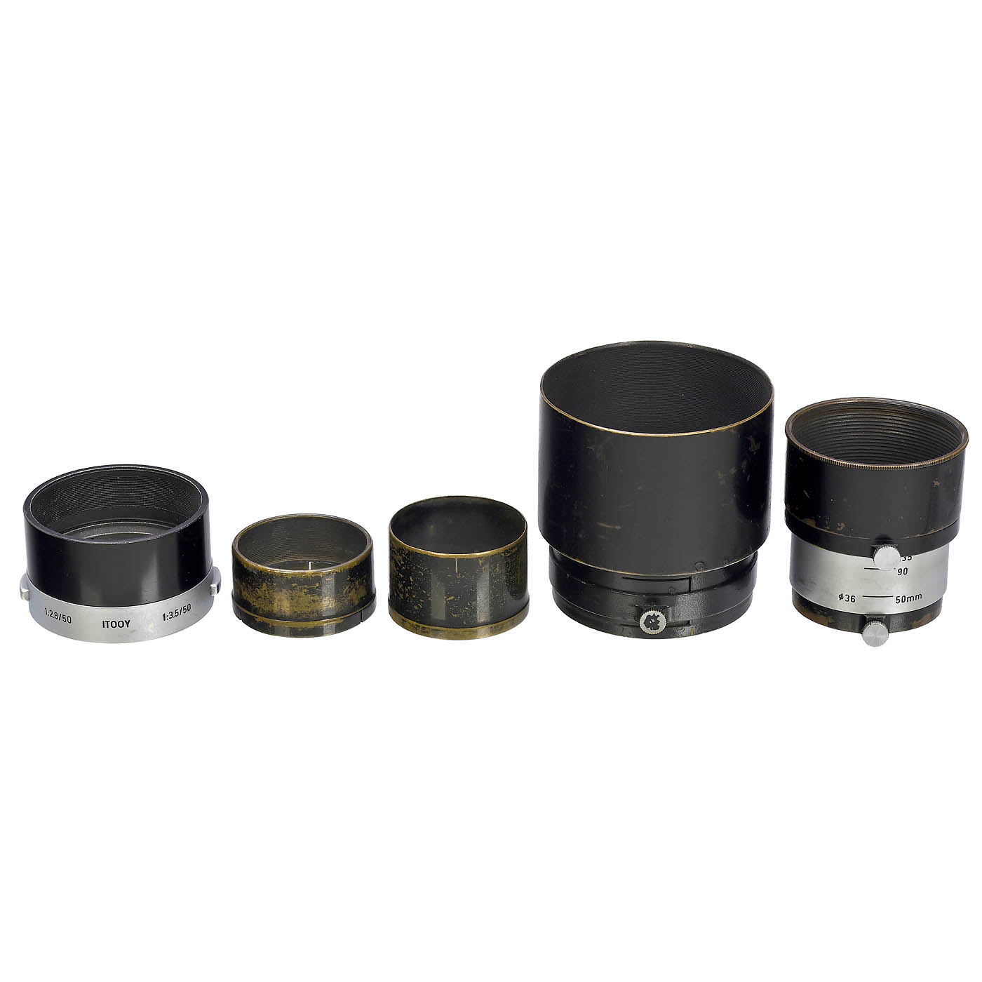 Leitz, Wetzlar. 1) FISON for Elmar 3.5/50. Very early version without index line, height 19mm. – 2) FISON, very early version with white index line at the top, height 24.6mm. – Literature: James L. Lager, "Leica An illustrated History Vol. II – Lenses", p. 32. – 3) ITOOY for Elmar 2.8/50 mm. – 4) Unmarked lens hood for Telyt 4.5/20 cm. – And: 5) FIKUS universal hood 3.5–13.5 cm.