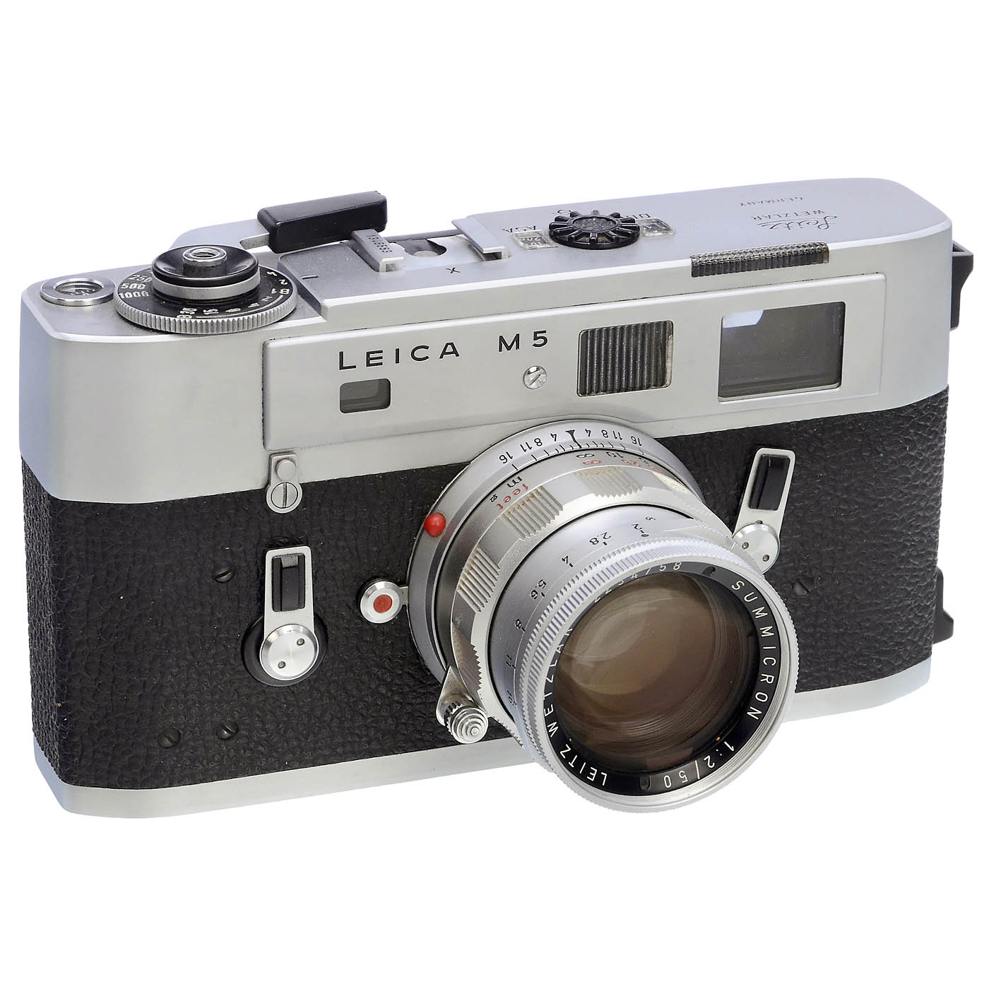 Leitz, Wetzlar. 1) M5 no. 1346583, chrome, two straps, rangefinder and shutter precise, dent on back under the film counter, otherwise in good condition, with case and instructions (copy). (3/2-) – And: 2) Summicron 2/50 mm no. 2234758, some fog visible under point light. (3/3-)