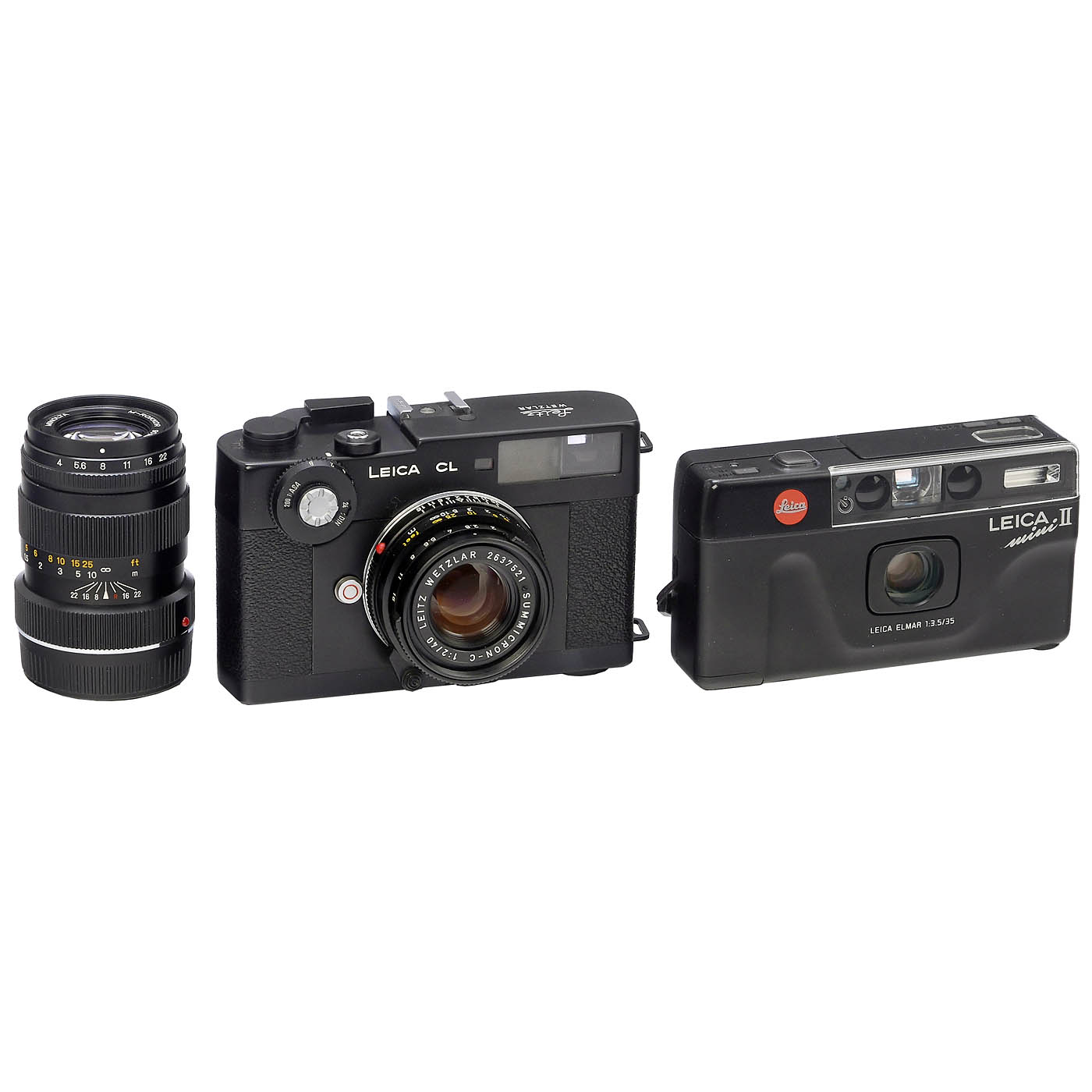 Leitz, Wetzlar. 1) Leica CL, no. 1326672, with Summicron-C 2/40 mm no. 2637521, glass clean under point light, exposure meter uneven, with sunshade and case. (3/3) – 2) Minolta M-Rokkor 4/90 mm no. 2014177, near mint condition, glass clean under point light, with sunshade. (2-/2) – And: 3) Leica mini II, no. 1935163, c. 1996. (3+/3)