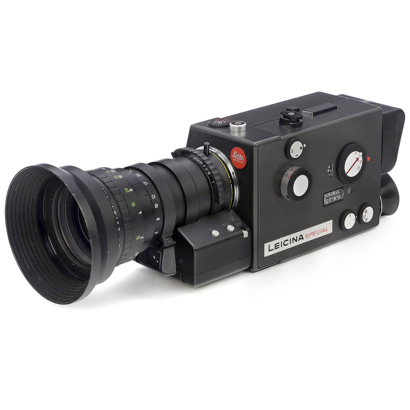 Leitz, Wetzlar. No. 085978, with Optivaron 1.8/6–66 mm no. 12674266 in Leica M mount, glass clean under point light. – Still one of the most sought-after professional Super-8 film cameras! Large lens selection thanks to the Leica M mount. Image speeds, zoom and automatic aperture control working, no further tests beyond that! With lens hood and eyecup.