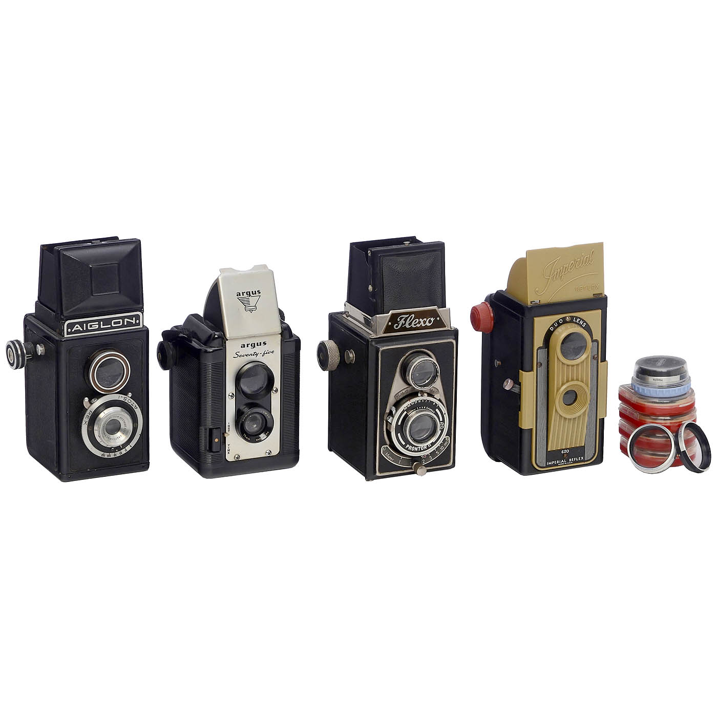 All cameras in collectible condition, but untested! 1) Atoms, France. Aiglon Mod. I, c. 1948, Berthiot Anastigmat 8/75mm. – 2) Ansco, USA. Ansco Automatic reflex 3.5 c. 1947, Anastigmat 3.5/83mm. – 3) Argus, USA. Argus Seventy-five, c. 1950, Lumar 75 mm. – 4) Meopta, Prerau. Flexaret Standard, c. 1964, Belar 3.5/80 mm. Good condition and with original accessories: 4 color filters, 2 close-up lens sets, lens hood and cap. – 5) Flexaret IV a, c. 1956, Belar 3.5/80 mm. – 6) Lippische Camerafabrik, Barntrup. Flexo, c. 1949, Ennar 3.5/7.5 cm. – 7) Rollop II, c. 1954, Ennagon 3.5/7.5 cm. Sought-after German TLR camera with close-up lens set and original Plexi cap. – 8) George, USA. Imperial Reflex 620, c. 1955. – 9) Montanus, Solingen. Plascaflex PS 35, c. 1952, Plascanar 3.5/75 mm. – 10) ROCCA Automatic, c. 1954, Rodenstock Trinar 2.8/80 mm. Rarely found! – 11) Light Industrial Products, China. Seagull 4A, c. 1970, Haiou 3.5/75 mm. Popular user camera! – And: 12) WZFO, Poland. Start, c. 1954, Euktar 4/75 mm.
