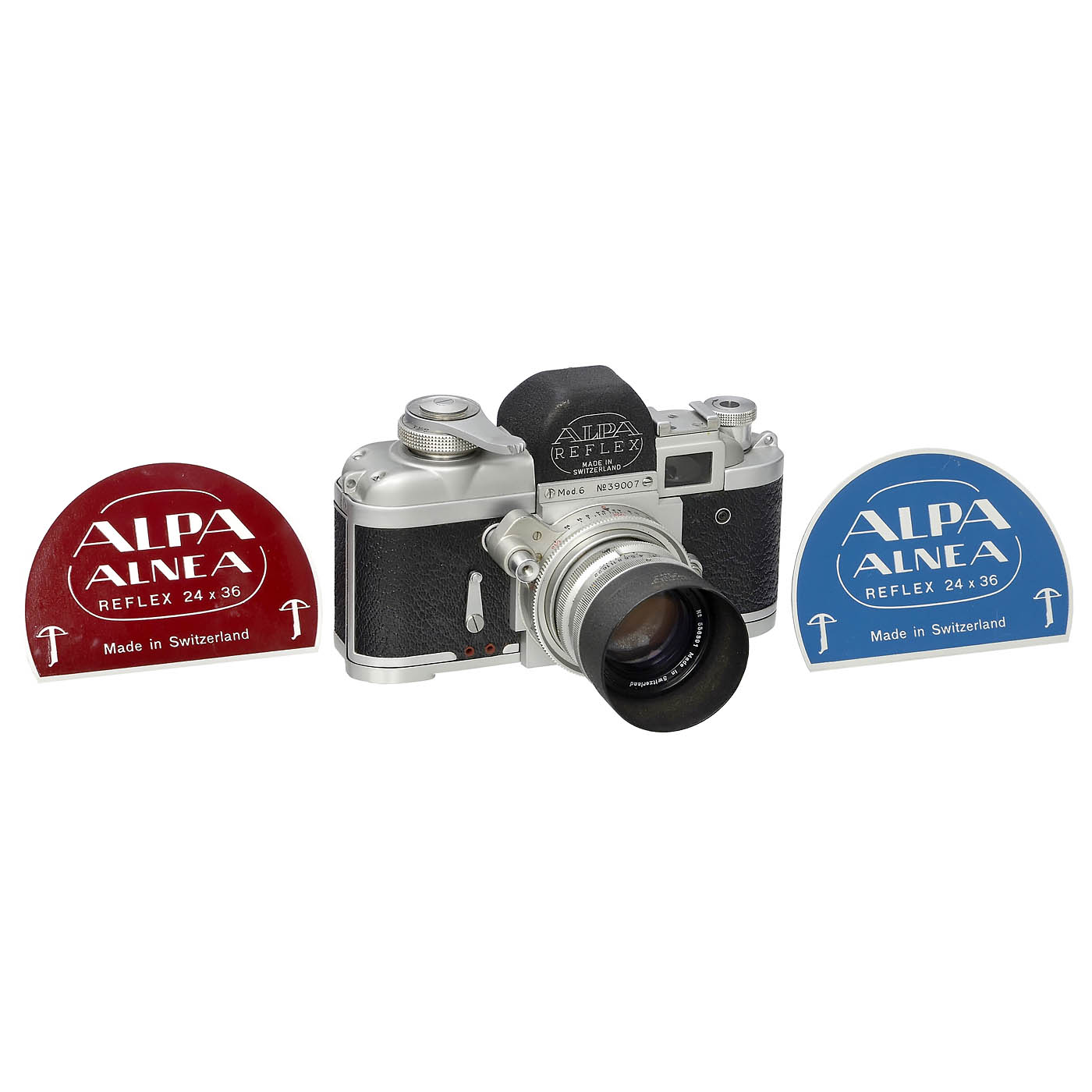 Pignons, Switzerland. No. 39007, shutter releases, even at long exposures, Kern-Switar 1.8/50 mm no. 556891, glass good under point light, with lens hood and cover. – In addition: 2 aluminum shop window "Alpa Alnea" advertising displays in red and blue, approx. 10 cm long, underside: "Pignons S.A. Ballaigues".