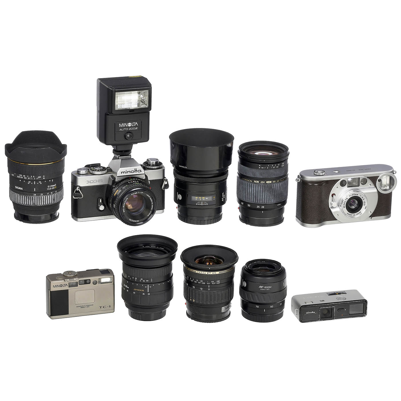 Collection of a Minolta user: 10 cameras and 14 lenses, with sticker "Go for Minolta". 1) Photograph 24 x 30 cm by Bernd Lohse, 1951, on the back: "…shows: the then chief accountant of the Minolta camera factory in Osaka". With letter. – 2) Minolta Shogun board game, gift to visitors to the exhibition of Japanese culture and history in the Haus der Kunst in Munich in 1984. – 3) 10 cameras by Minolta: Dynax 5D, 800Si, 7000i, Konica-Minolta Dynax 5D, TC-1 (with box), Riva, Prod-20’s (new, with box), Minolta 16, XL401, XD5. (2–3/–) – 4) 7 lenses by Minolta: 1.7/50, 2.8/135, AF Macro 2.8/50, 1.4/50 AF, AF Zoom 3.5–4.5/35–105, AF 1.4/85, AF Zoom 3.5–4.5/35–70. (3/3) – 5) 4 lenses by Sigma: 4.5–5.6/12–24 D DG; 4–5.6/70–300 DL Macro; 3.8–5.6/28–200 asph UC; Zoom UC-II 4.5–5.6/70–210. (3/3) – 6) Sony 4.5–5.6/70–300 SSM, Tamron SP AF asph Di II LD (IF) 4.5–5.6/11–18 and SP AF asph XR Di LD (IF) 2.8/28–75 macro (front lens with marks from cleaning). (3/3) – And: 7) Literature, press photos, calendars and brochures. – Most cameras in average condition, but not tested, all lenses good to clean under point light, tested for mechanisms, but not tested for AF.