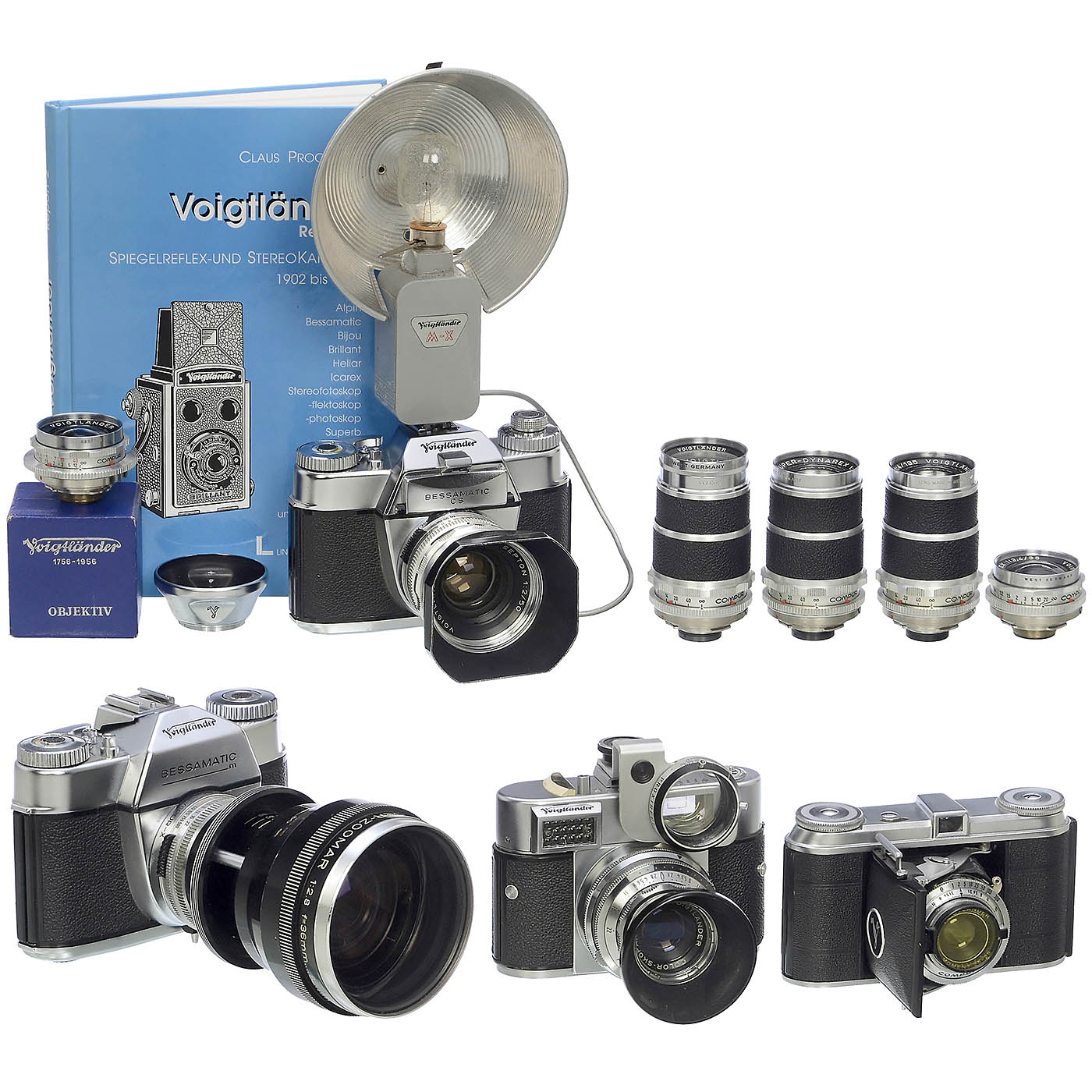 Voigtländer, Braunschweig. 1) Zoomar 2.8/36–82 mm, no. 4912526. Historic lens! On a Bessamatic m from 1963, shutter releases, electrics not checked. With Voigtländer transport case for camera and Zoomar. (3/3) – 2) Bessamatic CS with Septon 2/50 mm, lens hood 310/541, shutter working, electric functions not checked. (3+/3) – 3–4) Skopar 3.4/35 mm. (3/3) – 5–7) Super-Dynarex 4/135 mm and a case. (3/3) – 8) Vitomatic Ia, c. 1960, with Proxirect, Focar 2, lens hood 310/32 and Voigtländer M-x flash. (3/3) – 9) Vito, c. 1940, Skopar 3.5/5 cm, shutter too slow for long exposures, folding yellow filter. (2-/3) – And: 10) Book by Claus Prochnow, "Voigtländer-Report 2".