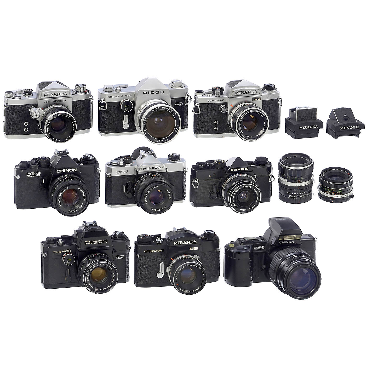 Miranda, Japan. 1) Miranda D, c. 1960, Miranda 1.9/5 cm, name engraved in the base. (3-/3) – 2) Miranda Sensomat, c. 1969, Miranda 1.8/50 mm. (3/3) – 3) Miranda Auto Sensorex EE, c. 1971, Miranda E 1.8/50 mm. In black, rarely found in this condition! (2–3/3) – 4–8) Light shaft, magnifying viewfinder 5x/15x, Miranda EC 2.8/35 mm, Soligor 2x teleconverter, Miranda 1.8/50 mm. (3-/–) – Riken Optical, Japan. 9) Ricoh TLS 401, c. 1970, Rikenon 1.7/50 mm. Black version, in beautiful condition! (3+/3) – 10) Ricoh Singlex TLS, c. 1970, Beroflex 2.8/28 mm. (3/3) – Chinon Industries, Japan. 11) Chinon CE-3 Memotron, c. 1978, Pentacon 1,4/50 mm. (3+/3) – 12) Chinon CP-9 AF Multi-Program, c. 1989, Chinon AF Zoom 3.5–4.5/35–135 mm, untested. (2-/–) – 13) Fuji Optical, Japan. Fujica STX-1, c. 1981, X-Fujinon 2.2/55 mm. (3/3) – And: 14) Olympus Kogaku, Japan. OM-1, c. 1973, Zuiko 2.8/35 mm. (3+/3) – All shutters release, other functions not tested, but all in collectible condition!