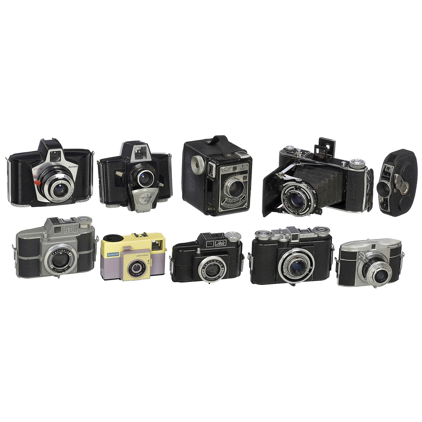 Italy, a country that has always inspired artists, is represented here with high-quality photographs of classic views from c. 1850 to 1890, appealing to the educated middle-class ideal of the time, and with useful cameras for everyman created post 1945 by art-loving designers (most cameras work): 1–4) Bencini, Milan. Rolet, 1946, 3 x 4, Comet S, 1951, 3 x 4, Comet III, 1953, 3 x 4, Korol S, 1953, 6 x 6. – 5–7) Durst, Bozen. Duca, 1946, for Agfa Rapid 24 x 36, Durst 66, from 1956, 6 x 6, with box, Automatica, 1956, 24 x 36, Radionar 2.8/45 mm – one of the most sought-after Durst cameras! – 8–19) Ferrania, Milan. Astor, 1953, 6 x 6, Condor 1, 1950, 24 x 36, rare, Condoretta, 1951, 24 x 36, Eura, 1959, 6 x 6, Euralux 44, 1961, 4 x 4, Falco 5, 1950, 6 x 9, Ibis 75, 1950, 4 x 6, Ibis, 1963, 6 x 6, Lince 2, 1961, 24 x 36, Tanit, 1955, 3 x 4, Veramatic, 1962, Instamatic-126, Zephir, 1960, 24 x 36, and 4 Ferrania rollfilms. – 20) Klein, Rome. Klein, 1953, 24 x 36. Very rare! – 21) GGS, Milan. Lucky, 1948, 24 x 36, Solar 3.2/50 mm, sought-after Italian camera! – And: 22–42) 21 albumen photographs on cardboard up to format 42 x 31 cm, some by Alinari, image tone well preserved (no stains); views that are still unclouded by automobiles and disfiguring modernity.