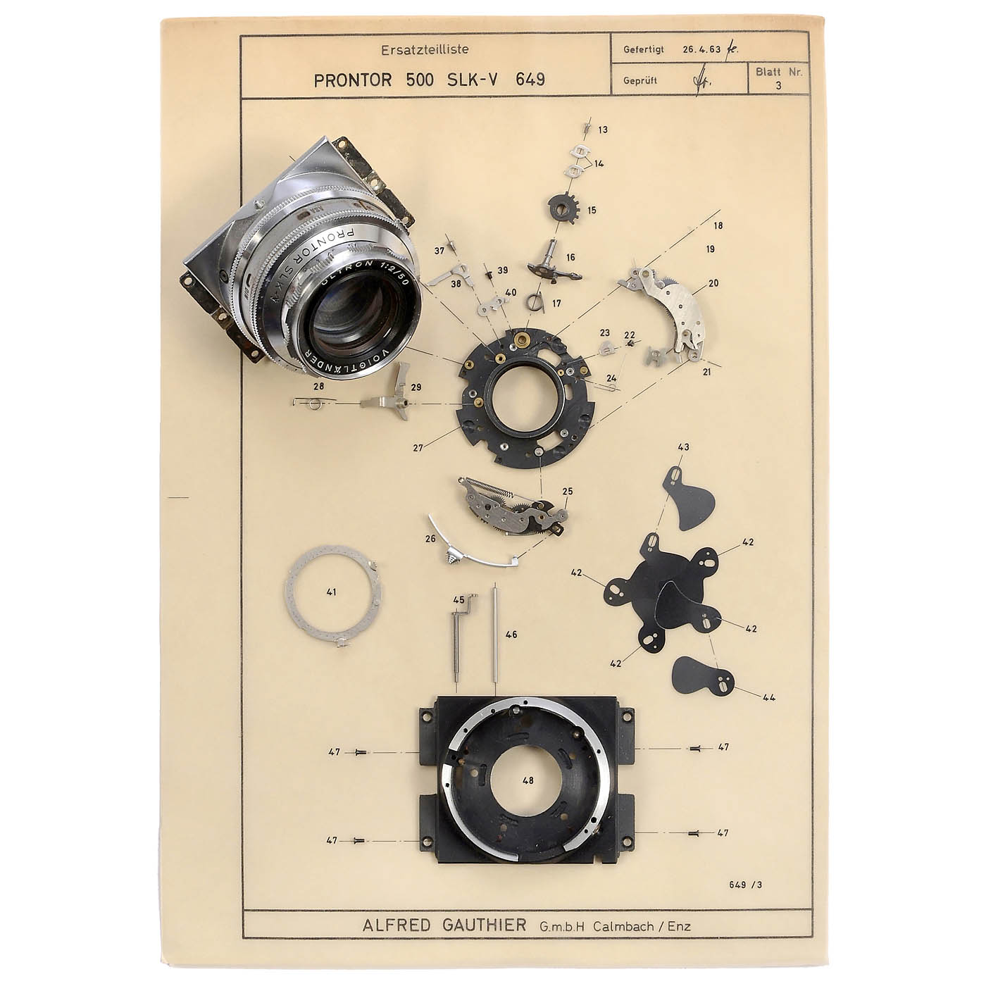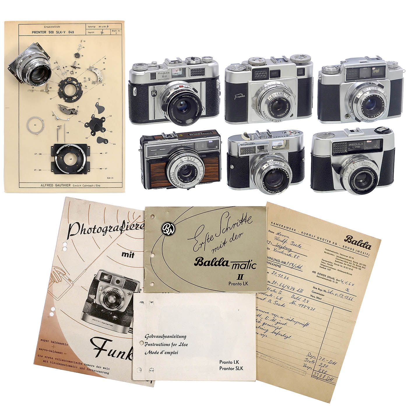 1) Alfred Gauthier GmbH, Calmbach. Original spare parts list with real, mounted individual parts on A4 parchment. Excellent exhibit. With full working shutter Prontor SLK-V and Ultron 2/50 mm. – All cameras with a comparable shutter from this series: 2) Agfa, Munich. Silette SLE, c. 1958, Color-Soplinar 2.8/50 mm in Prontor SLK. – 3) Franka, Bayreuth. Super Frankette, c. 1950, Ennit 2.8/45 mm in Prontor-SVS. – 4) Regula, Bad Liebenzell. Regula IIId automatic, c. 1956, Color Westanar 2.8/50 mm interchangeable lens in Pronto SLK. – 5) Regula LKB, c. 1962, Cassar 2.8/45 mm in Prontor 500 LK. – 6) Voigtländer, Braunschweig. Vitomatic IIa, c. 1964, Ultron 2/50 mm in Pronto SLK. – 7) Zeiss Ikon Voigtländer Vitessa 500 AE electronic, c. 1968, Color-Lanthar 2.8/42 mm in Pronto 500 electronic. – And: 8) Brochures and instructions for Prontor 500 SLK, basis for "the first fully automatic camera in the world with automatic aperture and remote control" according to the Balda brochure. – All cameras in collectible condition, all untested. An eye-catcher for fans of German camera history!