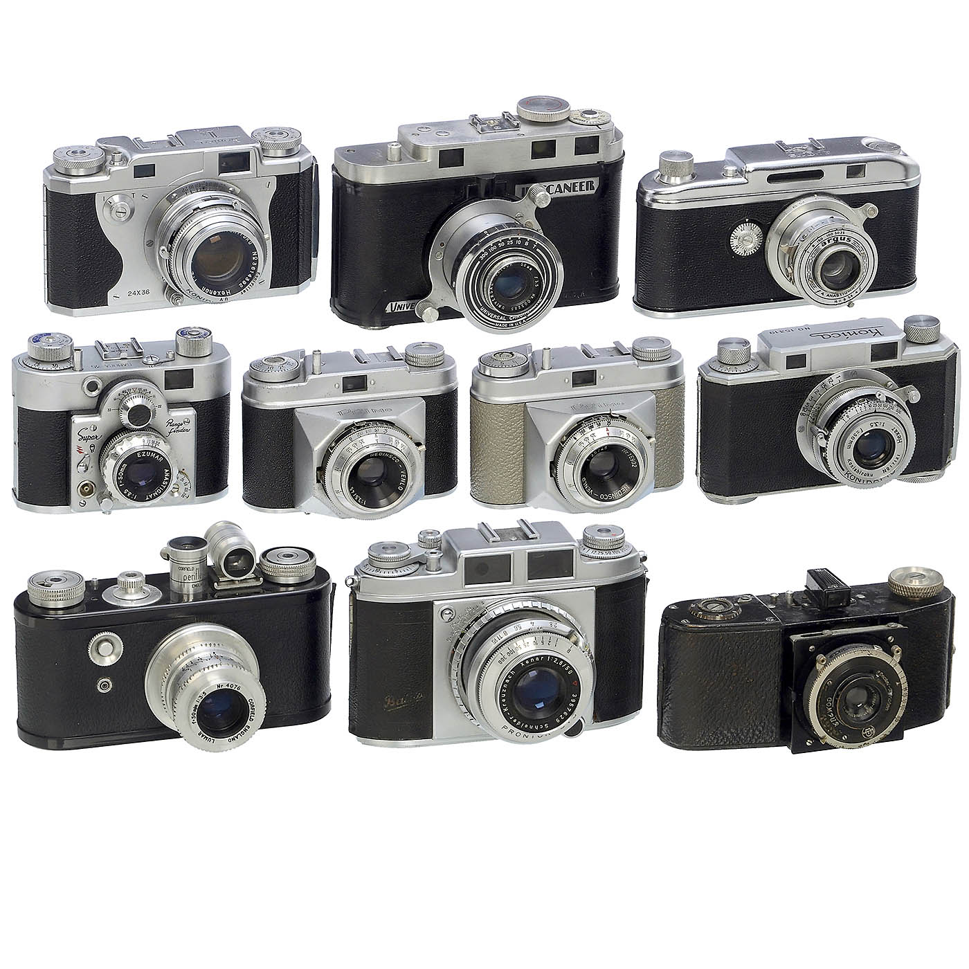 All for 135 film. 1) Corfield, England. Periflex 1, c. 1955, no. 514050, with retractable miniature reflex viewfinder, black version with chrome ring for the shutter speeds, Lumar 3.5/50 mm, in fine condition! (3+/2-) – 2) Konishiroku, Japan. Konica I, c. 1948, no. 15319, Hexar 3.5/50 mm, Konirapid shutter, small pieces of the leather trim missing. (3+/2-) – 3) Konica IIA, c. 1956, no. 111154, Hexanon 2/48 mm, iris blades loose, otherwise in good condition, with original UV filter. (3+/–) – 4) Nedinsco, Netherlands. Primo, gray, c. 1958, Venlo 3.5/45 mm. (3/3) – 5) Primo, black version. (3-/3-) – 6) Sanei Sangyo, Japan. Samoca-35 Super, c. 1956, no. 595397, Ezumar 3.5/50 mm. (3/3) – 7) Argus, USA. Argus A3, c. 1940, Anastigmat f=4. (3/3) – 8) Balda, Bünde. Super-Baldina, c. 1954, no. 008726, Xenar 2.8/50 mm, very good condition. (2-/2) – 9) Universal Camera, USA. Buccaneer, c. 1945, Tricor 3.5/50 mm. (3/2-) – And: 10) Beier, Freital. Beira I, c. 1932, Trinar 4.5/5 cm. (3-/3-)
