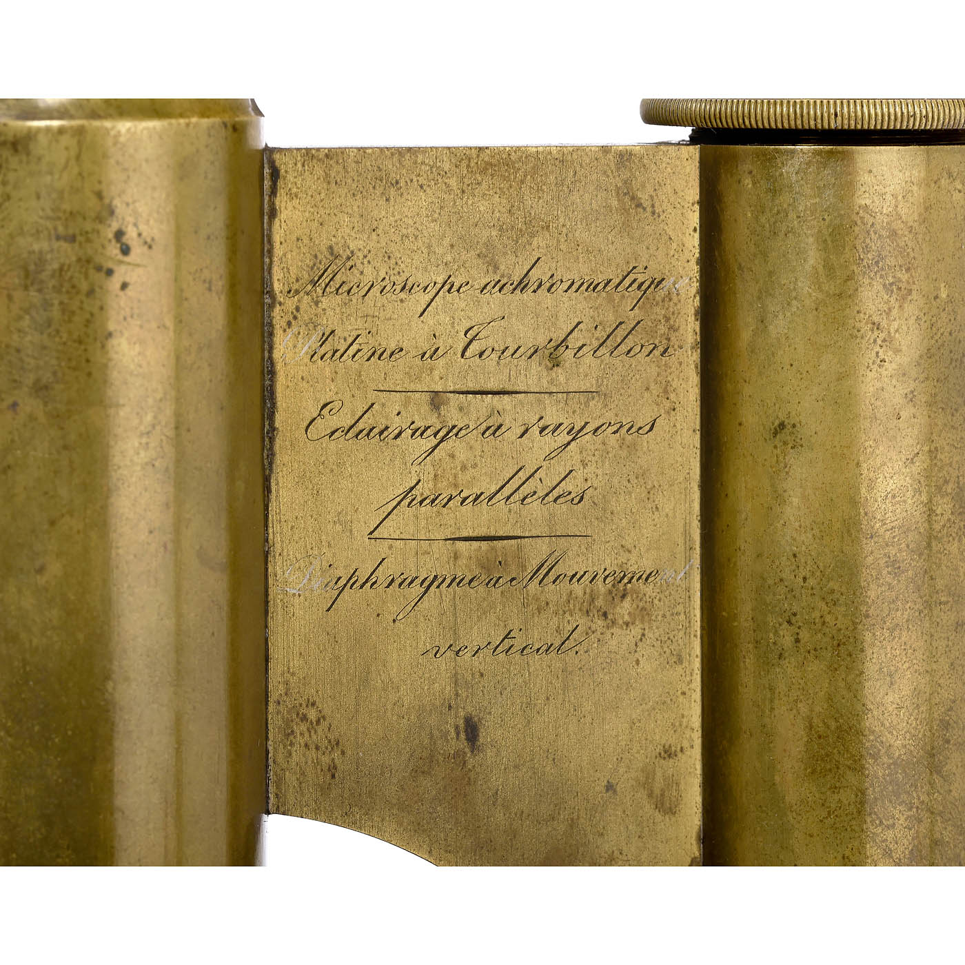 Georges Oberhäuser, Paris, No. 794, limb engraved on both sides "Georges Oberhaeuser, Ingenieur Opticien, breveté, Place Dauphine, 19 Paris" and "Microscope achromatique Platine à Tourbillon. Eclairage à rayons parallèles. Diaphragme à mouvement vertical.", original lacquered and partly green patinated brass, height 13 ¾ in., 3 objectives (no. 4, 7 and 8) with pinhole diaphragms in original case, 4 eyepieces (no. 3, 4 and 2 x 2), with Camera Lucida after Oberhäuser and stand with holder for a reflected-light magnifier (magnifying glass missing), in original mahogany case with lock and key. – This microscope is described in detail in: ‘Das Mikroskop’, Pieter Harting, Braunschweig 1859, pp. 766–768.