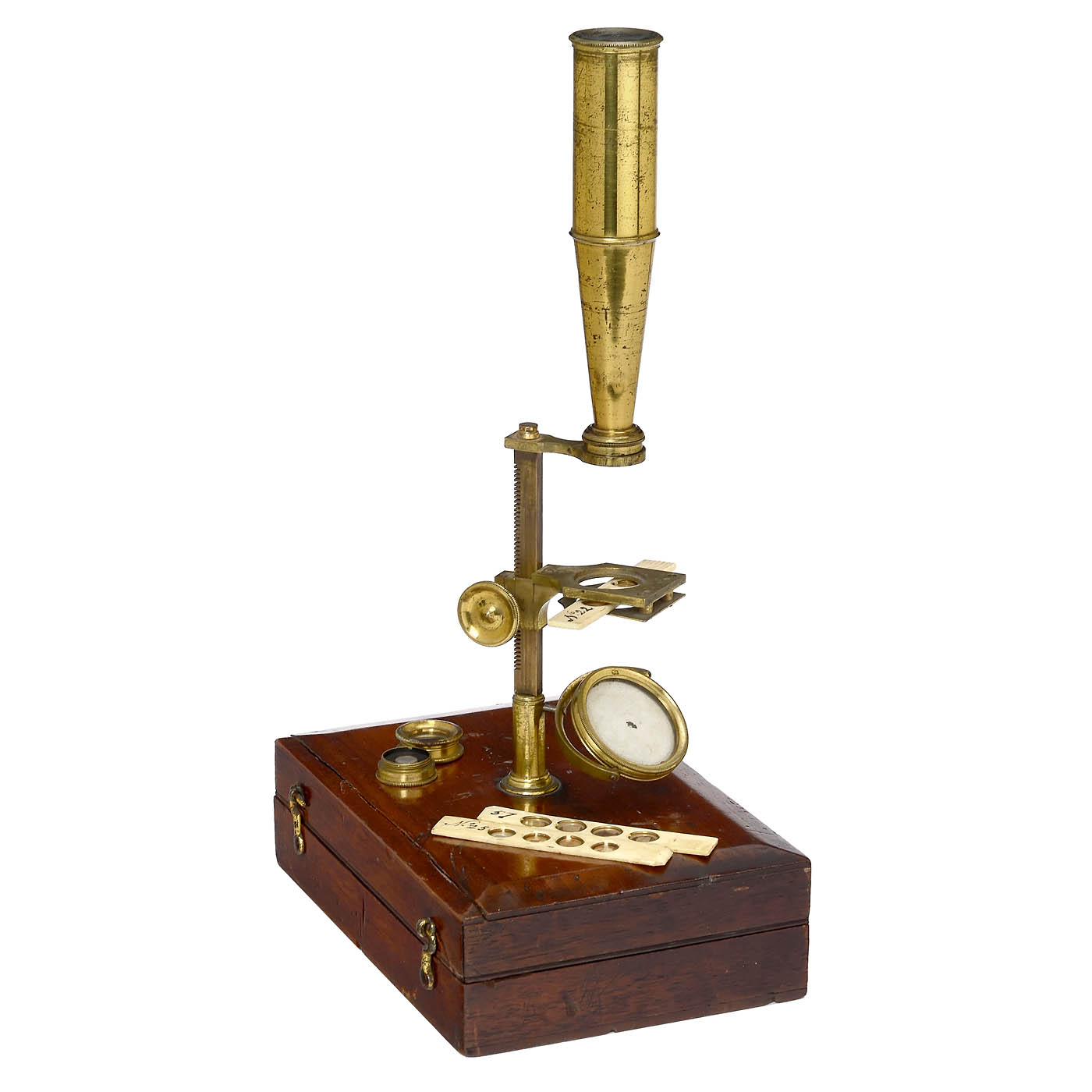Gould-type brass microscope with gimbaled 1 1/2 in. single mirror, milled-head screw fine adjustment to the table, with threaded mount to rectangular mahogany box base (6 ½ x 4 ½ in.), height without box base 9 ½ in., with 1 ocular, 1 objective lens and 3 specimen slides.