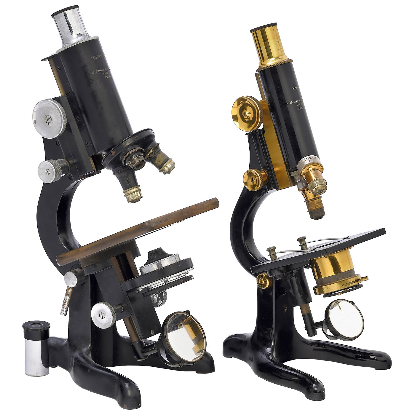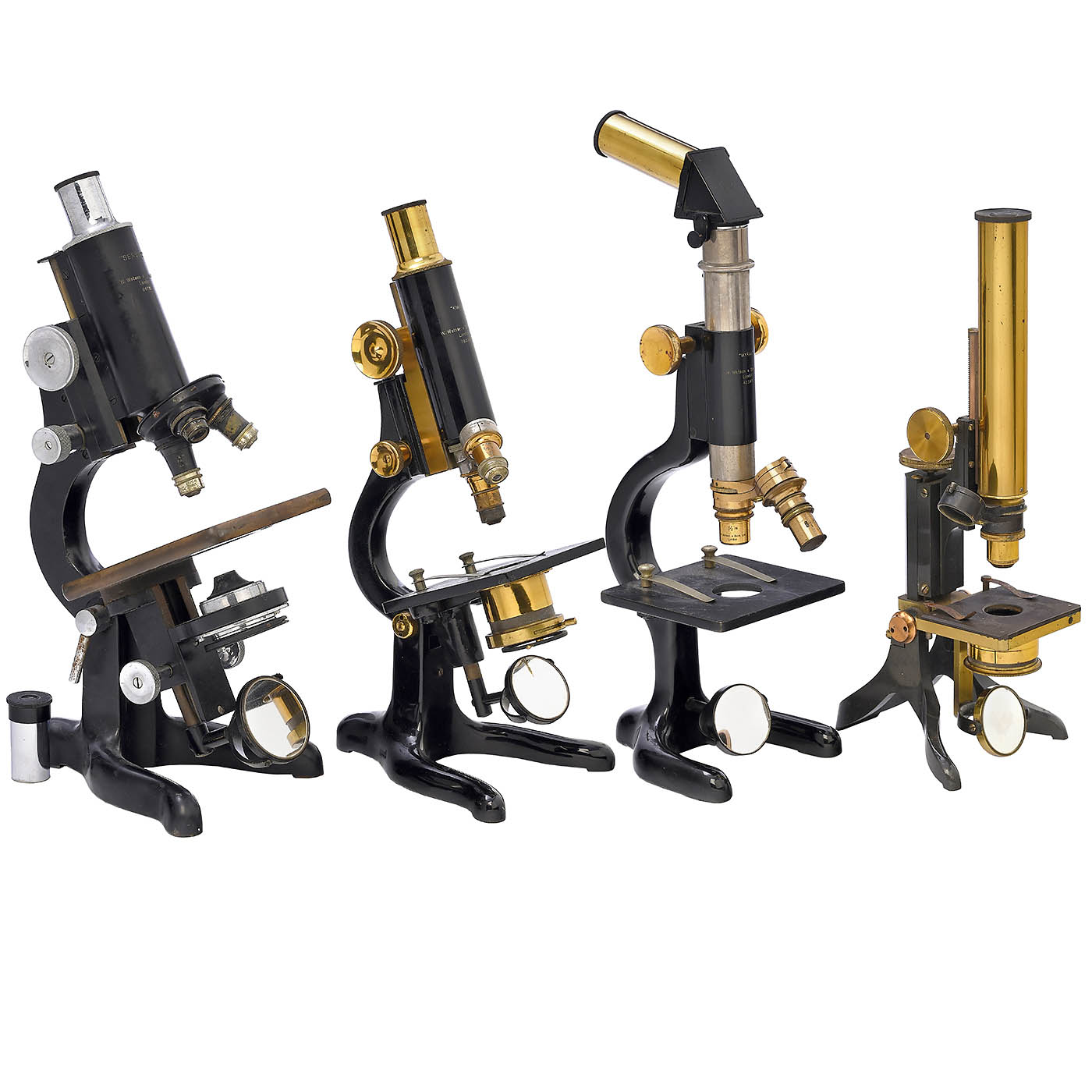 1) Swift & Son, London, c. 1910, original lacquered and black-painted brass, double mirror, tilting stand, coarse and fine adjustment, double-turret, height 11 in. – 2) Watson & Son, London, "Kima", c. 1926, original patinated and black-lacquered brass, double mirror, iris diaphragm, condenser, tilting stand, coarse and fine adjustment, double-turret, height 12 ½ in., in wood case. – 3) Watson & Son, London, "Myral", c. 1920, original lacquered and black-painted brass, single mirror, double-turret, tube with prism, height 14 in. – And: 4) Watson & Son, London, "Service", c. 1930, double mirror, iris diaphragm, condenser, tilting stand, coarse and fine adjustment, triple-turret, height 13 in., in wood case.