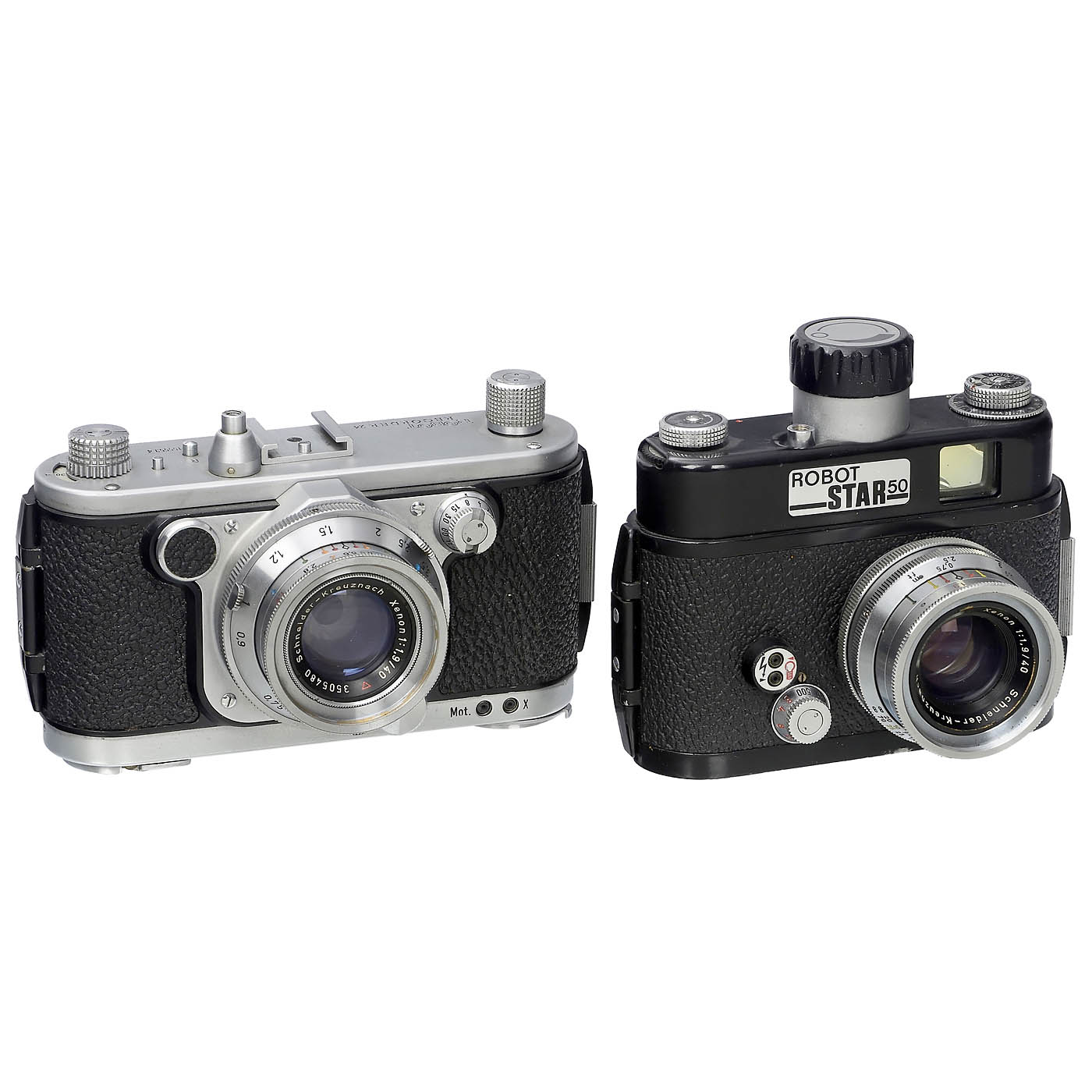 Berning, Düsseldorf. 1) Robot Star 50, c. 1969, no. 194389, for 24 x 24 mm, spring mechanism runs well, Xenon 1.9/40 mm, with Robot spool. (3/3) – And: 2) Robot Recorder 24, c. 1957, no. K-155553d, ½ and ¼ sec. stick intermittently, with cassette. (3+/3-)