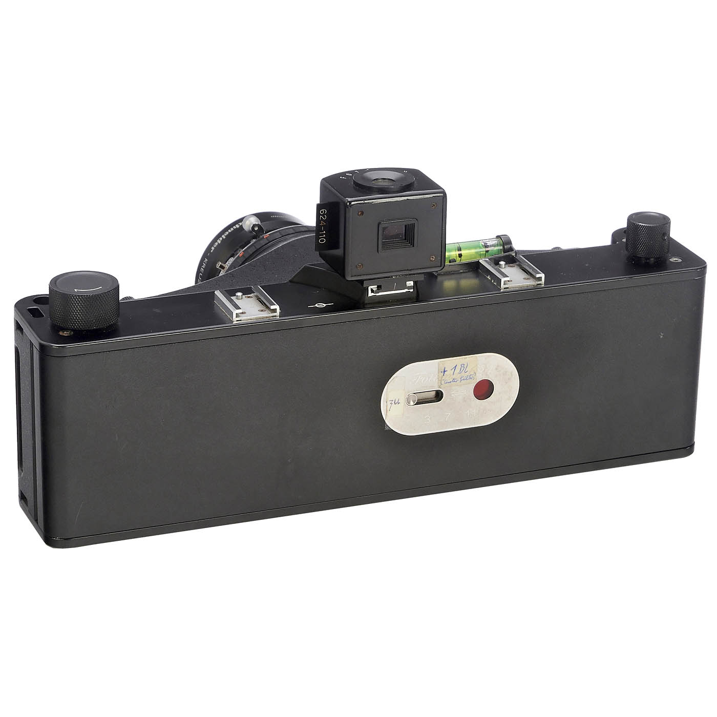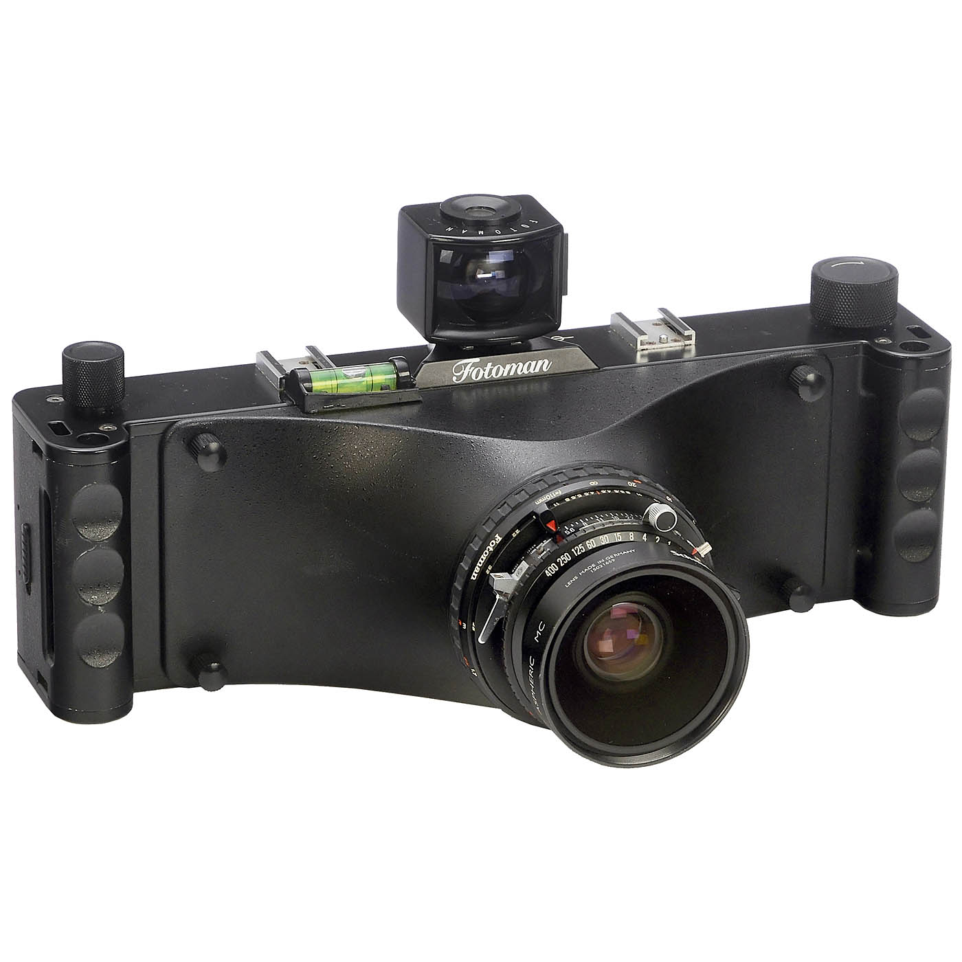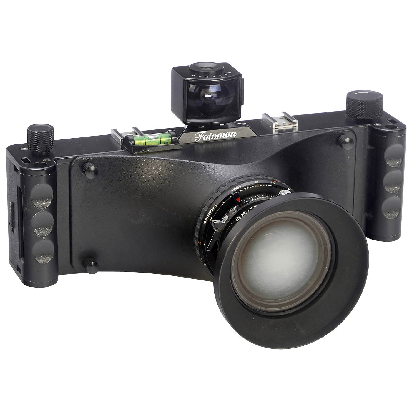 Shenzhen Fotoman Technology Development Co., Ltd, Shenzhen, China. Rollfilm camera for the format 5.6 x 22.4 cm on 120 rollfilm. Schneider Super-Symmar 5.6/110 mm XL-105° Aspheric MC no. 15021659, lens clean under point light, shutter working, Schneider Center Filter III B Multicoating, with lens hood, Fotoman viewfinder and magnetic focusing screen back for particularly precise image selection, focusing up to 1.7 m, the thread of this focusing screw has a play of about 0.3 mm, rear panel with signs of use, otherwise in good condition.