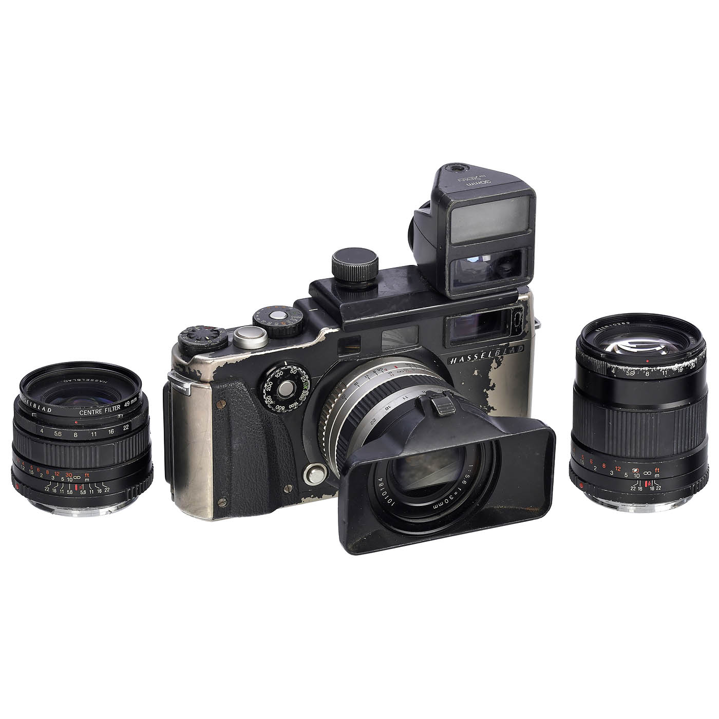 Hasselblad, Sweden/Japan. All lenses clean under point light. 1) Xpan no. 11EE14538, rangefinder camera for panorama exposures, 24 x 65 mm or 24 x 36 mm on 135-film, heavily worn, however rangefinder accurate, viewfinder clean and shutter working. (4/3) – 2) Super-EBC Fujinon 5.6/30 mm no. 1010184 with center filter, sunshade and 30 mm viewfinder. (4/2-) – 3) Hasselblad 4/45 mm no. 8YEE14256 with center filter, sunshade and case. (3/2-) – And: 4) Hasselblad 4/90 mm no. 8ZER10289, with case, heavy wear on aperture scale. (4/2-) – A sought-after high-quality camera for active use.