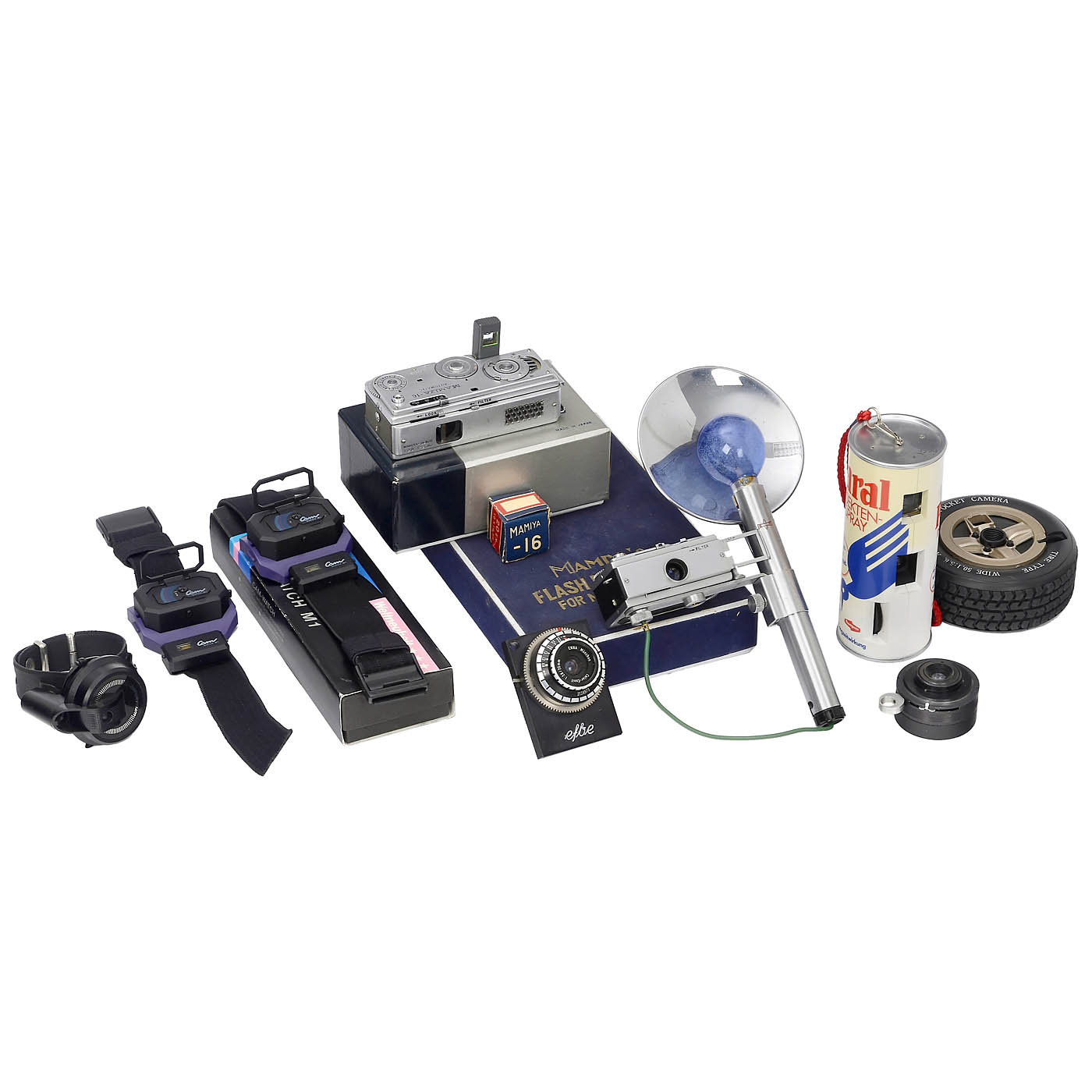 1) Franz Brinkert, Duisburg. Efbe, c. 1979, Color-Ennit 2.8/20 mm, for 6 exposures on a round 47mm film disc, rear panel mounted using a magnet. (3+/3+) – 2) Round, easy-to-grip "hand pattern", probably Brinkert, lens, back with rotating disc with numbers 1–6. (3/–) – 3) Magnacam, USA. Wristamatic, c. 1981, wristwatch camera for 6 images on round film. (3/–) – 4–5) Chadt (Revue). Cam-Watch M1, wristwatch for Minox films, with a box (box with instructions) and one with Cam digital watch M1. (2-/3) – 6) Eiko, Taiwan. "Paral" box with pocket camera type 110, c. 1980. (3+/3) – 7) "Tire Type", pocket camera in the shape of a car tire. (3/3) – 8) Mamiya, Japan. Mamiya 16 super, with box (Revue), manual, case and presentation box with flash and small accessories. (3+/2–3) – And: 9) Mamiya-16 Automatic, gray, light meter working. (3/2)