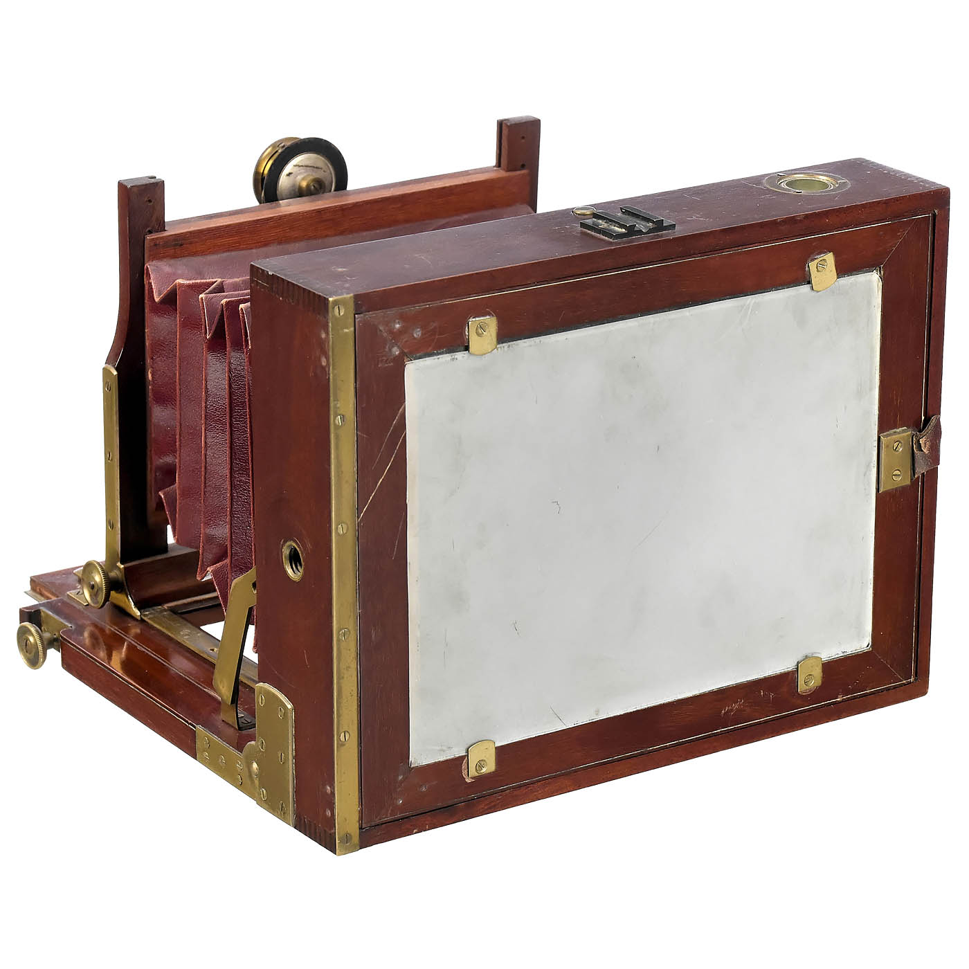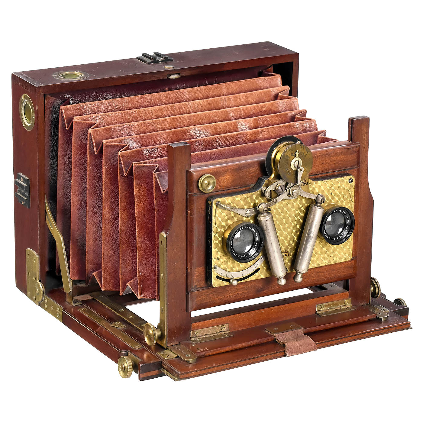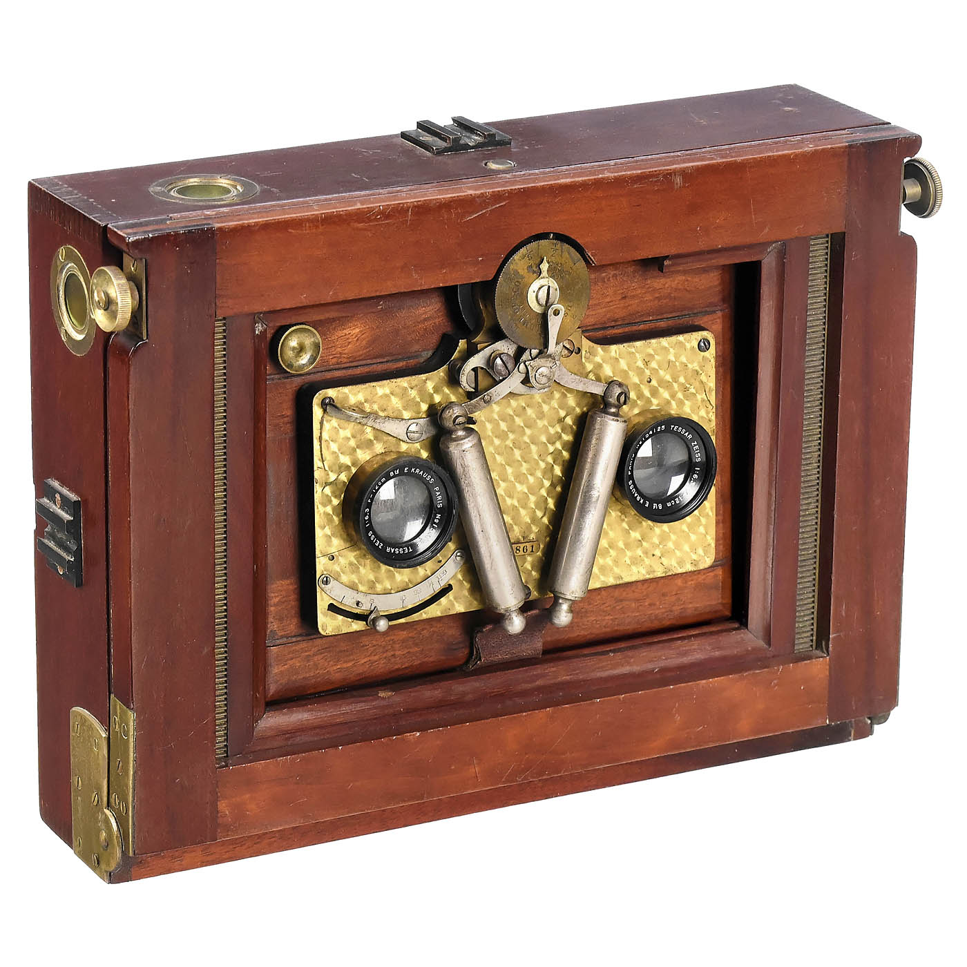 France. For 13 x 18 cm, dark-red wood with dark-red bellows, interior intended for stereo septum, brass fittings, double extension, very decorative Bausch & Lomb stereo shutter no. 861, with 2 x Krauss Tessar 6.3/12 cm (one lens element with a small crack), shutter working (clamp requires slight force), spirit level working, with focusing screen back.