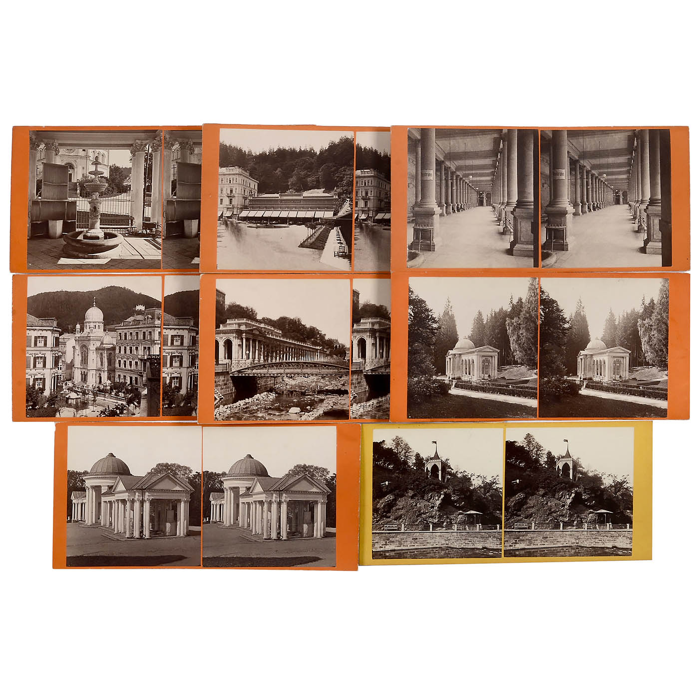 1–2) Early stereo viewers with burl wood veneer for 9 x 18 cm stereo slides or stereo cards in the versions with normal eyepieces or prism eyepieces. (3/3) – 2) 10 early collodion slides 9 x 18 cm. – 3) Early stereo cards 9 x 18 cm, in varying condition, but without stains: 8 x cards on the development history of the stereo card front page layout, 4 x Amsterdam, 13 x Switzerland, 30 x Italy, 18 x Germany/Austria, 16 x Karlsbad/Marienbad in mint condition, 11 x Photograph Hautecoeur Paris, 17 x Paris/France, 9 x England (2 x with names: Mann and Slingsby) and 7 x World's Fair 1878 and 1867. – And: 4) Stereo cards after 1900: 21 NPG Berlin glossy cards. (3+/–)
