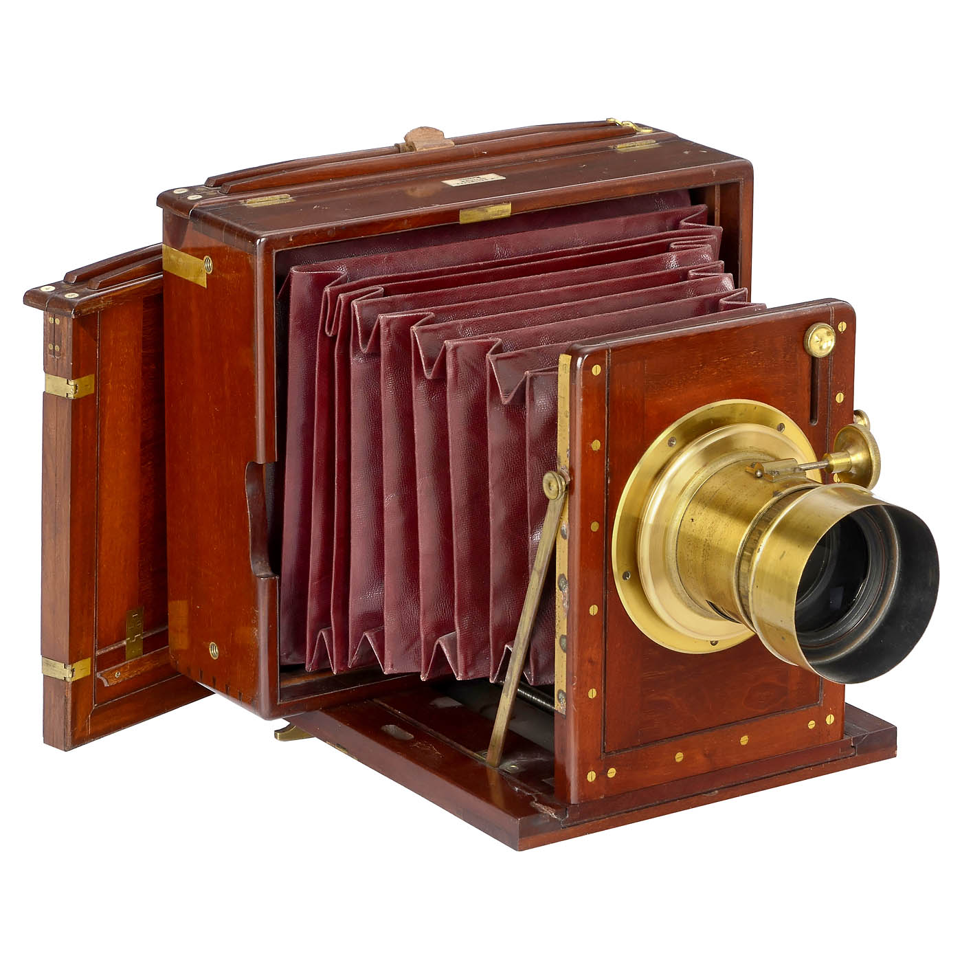 J.H. Dallmeyer, London. Mahogany with brass fittings, wine-red bellows, for 8 x 10 in. plates, base with double-extension using a crank on the back, back part can be adjusted for shorter focal lengths using 2 screws on the underside of the base, focusing screen back can only be pulled out by opening a small hinge, with 2 good double-cassettes, brass-bound Petzval type lens by Vogel, Philadelphia no. 5258 3.4/25 cm (some scratches on back lens, otherwise clean), adapted to screw-on ring using an adapter ring. – Well preserved, sturdy construction and a beautiful display piece!