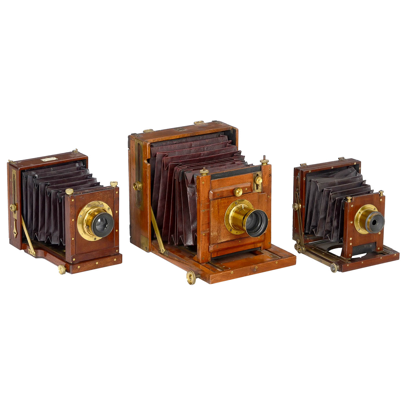 3 English travel cameras for plates made of mahogany with brass fittings, common feature is the screw-on standard holders, all with brass-bound lenses and focusing screen backs. 1) Watson & Sons, London. Field camera for plates of 10 x 12.5 cm, Ross London 8 inch Concentric, with double-cassette. – 2) Perken, Son & Rayment, London. "Rayment’s Patent" for 5 x 7 in. (half plate), dark-brown bellows, Busch Rapid Aplanat no. 3, with matching double-cassette from Thornton Pickard. – And: 3) The Midland Camera Co, Birmingham. "The Midland", for 10.5 x 8 cm, landscape lens with iris diaphragm.