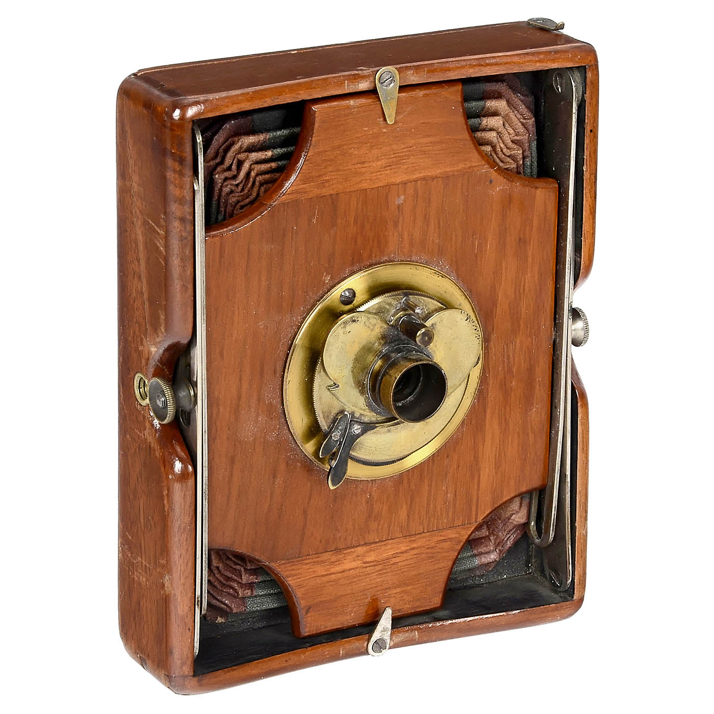 1) Pocket strut camera, difficult to categorize, because only 4 cameras with various classifications are thus far known to exist: "Elb Spreizenkamera" (Abring IV no. 3750) or "Le Néo" (Martin catalog, 1893 by Emilio Resti Milano, p. 19). For 9 x 12 cm, folded up with 153 x 120 x 45 mm, very compact, real skirt pocket camera. Landscape achromat approx. 11/110 mm, rotating drop shutter with attached lens hood (spring missing, can be replaced), recessed lens can be unscrewed for portrait shots (exactly 1.2 m distance), gray linen bellows with purple leather edge, sliding focusing screen back. Extremely unusual spreader construction, this early model is the original version without the later stabilization clamp as seen in Abring. Extremely rare! – And: 2) Field camera (possibly from the same manufacturer) for 13 x 18 cm, the lens board is original (no rework visible) with a larger lens of 18 cm and a revolver aperture as in 1) (one screw added, spring missing), with cap, focusing screen back and a double-cassette that can be inserted for travel transport. – This larger lens of the same design may help to clarify the attribution.