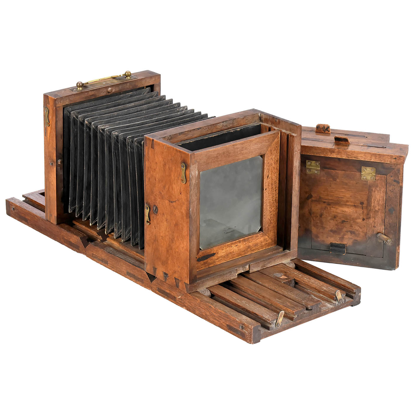 Probably French. Walnut, early bellows shape, for plates smaller than 11.4 x 11.4 cm, camera length 57 cm, unmarked brass-bound landscape lens of 24 cm with an insert stop and cap, back and front parts foldable, two of the four bracing struts are missing (can be replaced, camera is still very stable), interesting long back with space for 2 studio cassettes, whereby the focusing screen can be pushed between the two cassettes when transporting the camera to prevent it from breaking, with the two original cassettes A and B (with plenty of decorative collodion traces) and the focusing screen back. – An attractive and well-made camera from the early collodion era.