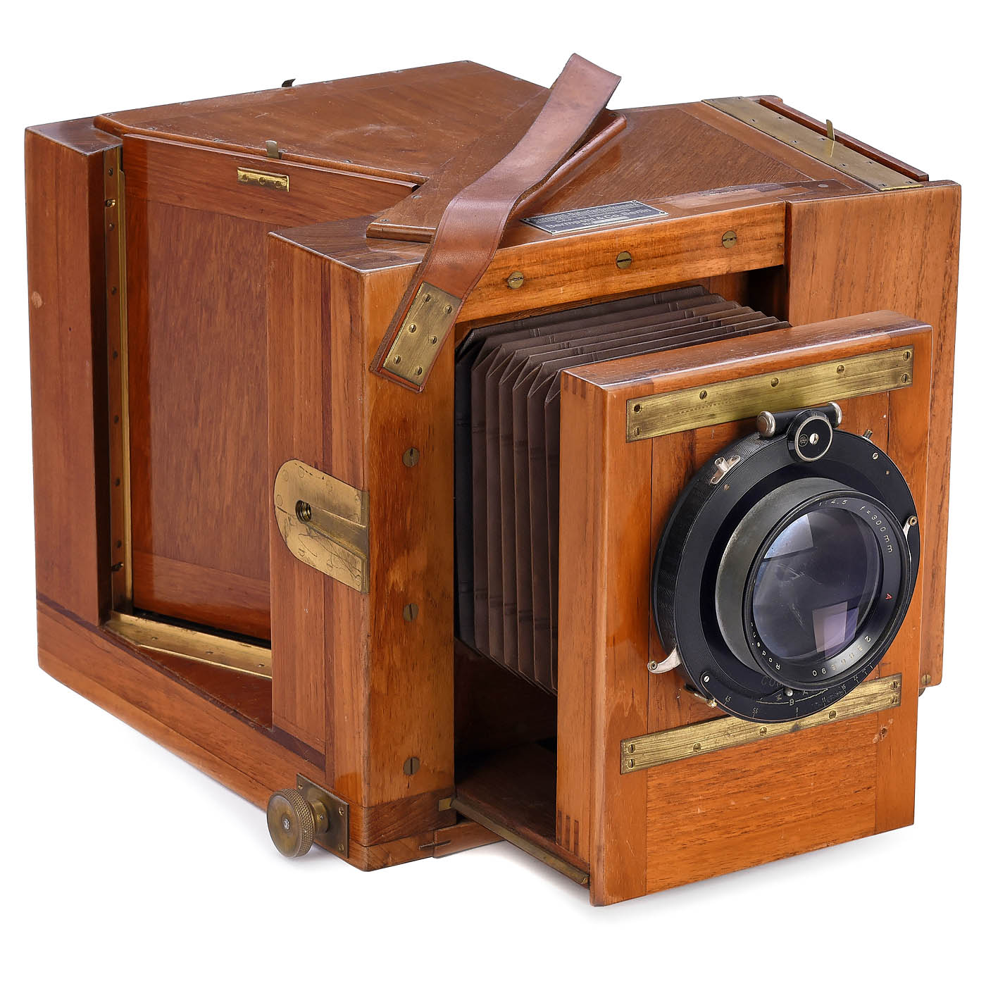 Bermpohl & Co., Berlin. Size 13 x 18 cm, beam-splitting tri-color camera no. 672, teak body, brass fittings, brown bellows, with beam-divider elements (inside there is a yellow filter in front of the red filter, the space between the yellow filter and the beam-dividers shows removable age deposits, disassembly is necessary to remove, with optically clean filters "Bermpohl-Filter 672 Nitraphotlicht grün 42/A", "Bermpohl-Filter 672 Vacublitz blau 4170" and "Bermpohl-Filter 564 Tageslicht rot 4310", focusing screen back and two cover shields. With Rodenstock Eurynar 4,5/30 cm A in Compound V, working. – An impressive and important collector's item and exhibition piece.