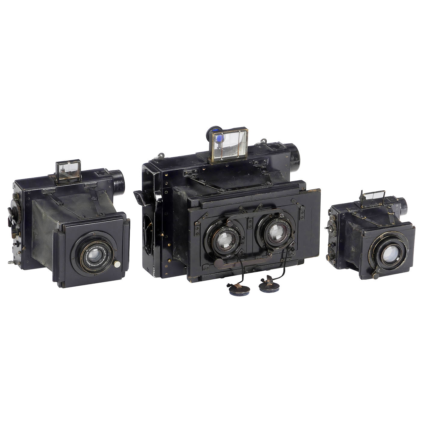 A. Stegemann, Berlin. All strut cameras (metal bars) with inoperative double-roller Stegemann shutter system, none of these formats have been featured in our auctions before, focus and apertures working. 1) Hand-Stereo-Camera no. 2028 for 10 x 15 cm plates, Carl Zeiss Jena Tessar 6.3/110 mm, without focusing screen back. (3–4/–) – 2) Hand-Camera no. 1628 for 6.5 x 9 cm, Meyer Euryplan 6.8/120 mm, with focusing screen back. (3/–) – And: 3) Liliput no. 1515 A, for 4.5 x 6 cm plates, unmarked 3.5/75 mm lens (possibly Rüdersdorf), front and rear lens engraved with no. 29680, with focusing screen back. (3–4/–)