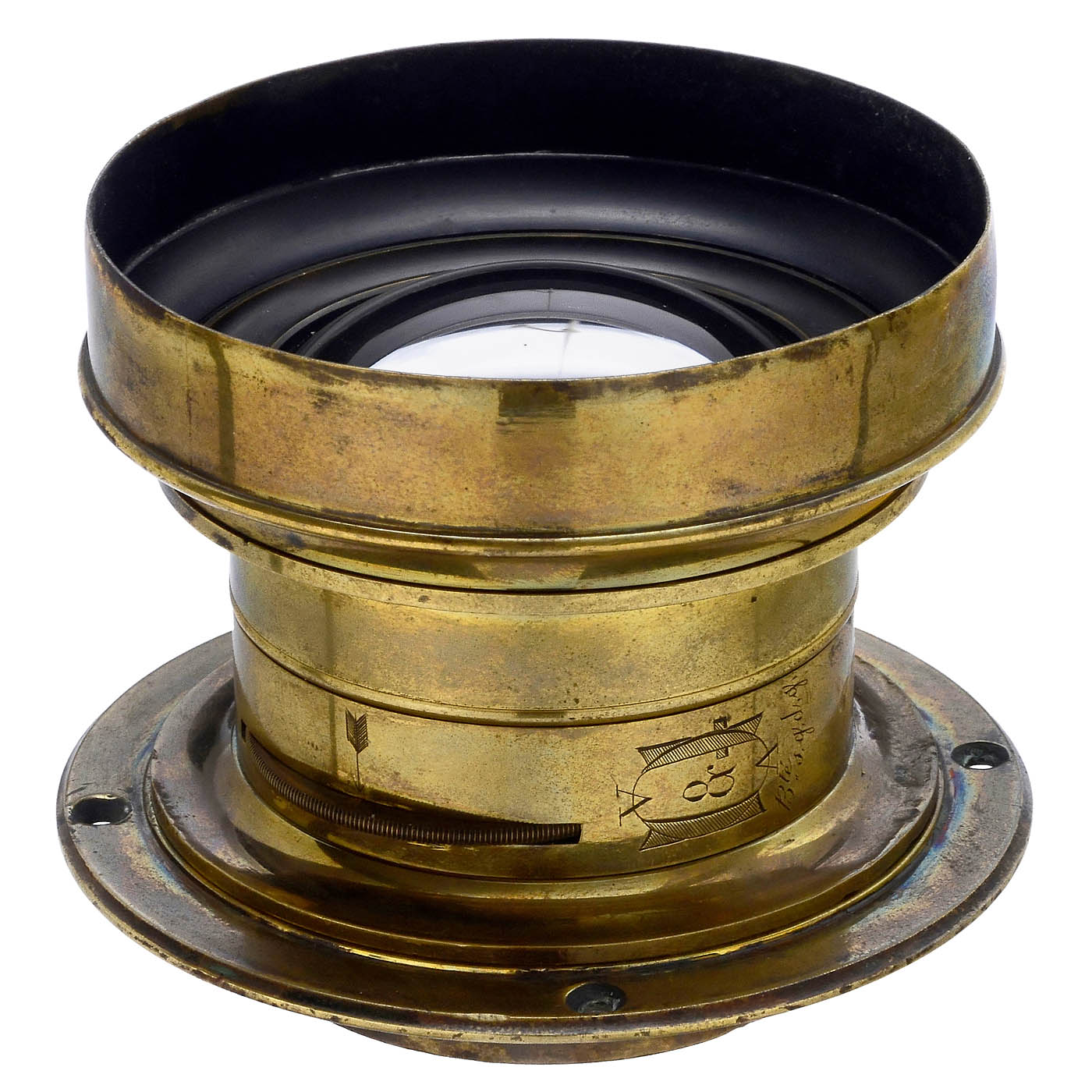 Gasc & Charconnet, Paris. Brass-bound wide-angle lens with a focal length of 25 cm and a free-standing rear lens, unnumbered. The lens halves are each achromatic lenses, a 5-fold revolver aperture in the optical center. Good glass under point light, the extremely curved and free-standing rear lens is surprisingly well-preserved. When checked with magnifying glass, light points at the edge of the image are sharp and without color fringes. According to D’Agostini, Photographic Lenses of the 1800’s in France, p. 290–291, this is the longest lens of this focal length, and was used for formats up to 30 x 40 cm. With screw-on ring. Very rare in this size!