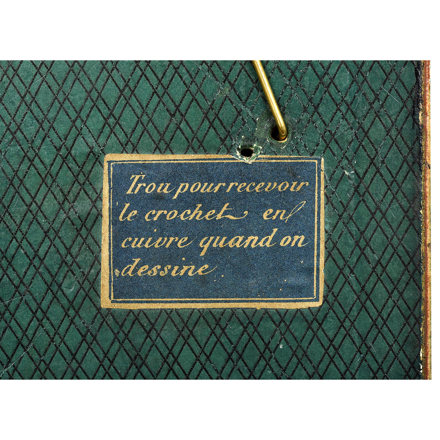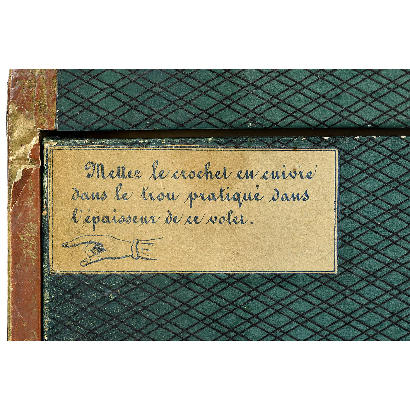 France. Polyorama Panoptique et Diagraphique – the small image viewer for day-and-night metamorphic images in the format 14.4 x 9.7 cm, size of the viewer 16 x 25 cm, height 13 cm, green bellows undamaged, front in mahogany with framed lens with a diameter of 3.2 cm, housing with green decorative paper, the following accessories are available for use in drawing: The original mirror, the original glass plate for placing tracing paper (with original tracing paper from the time with attempts to draw a portrait, the paper acts like a focusing screen) for copying, the original metal screen, the original cover "Papier Végétal Polyorama Panoptique et Diagraphique" (inside the banderole for the tracing paper has been replaced with a copy, the paper inside has also been supplemented) and the instructions for use (good color copy). With 3 day-and-night metamorphic images without cracks with views of Constantinople.