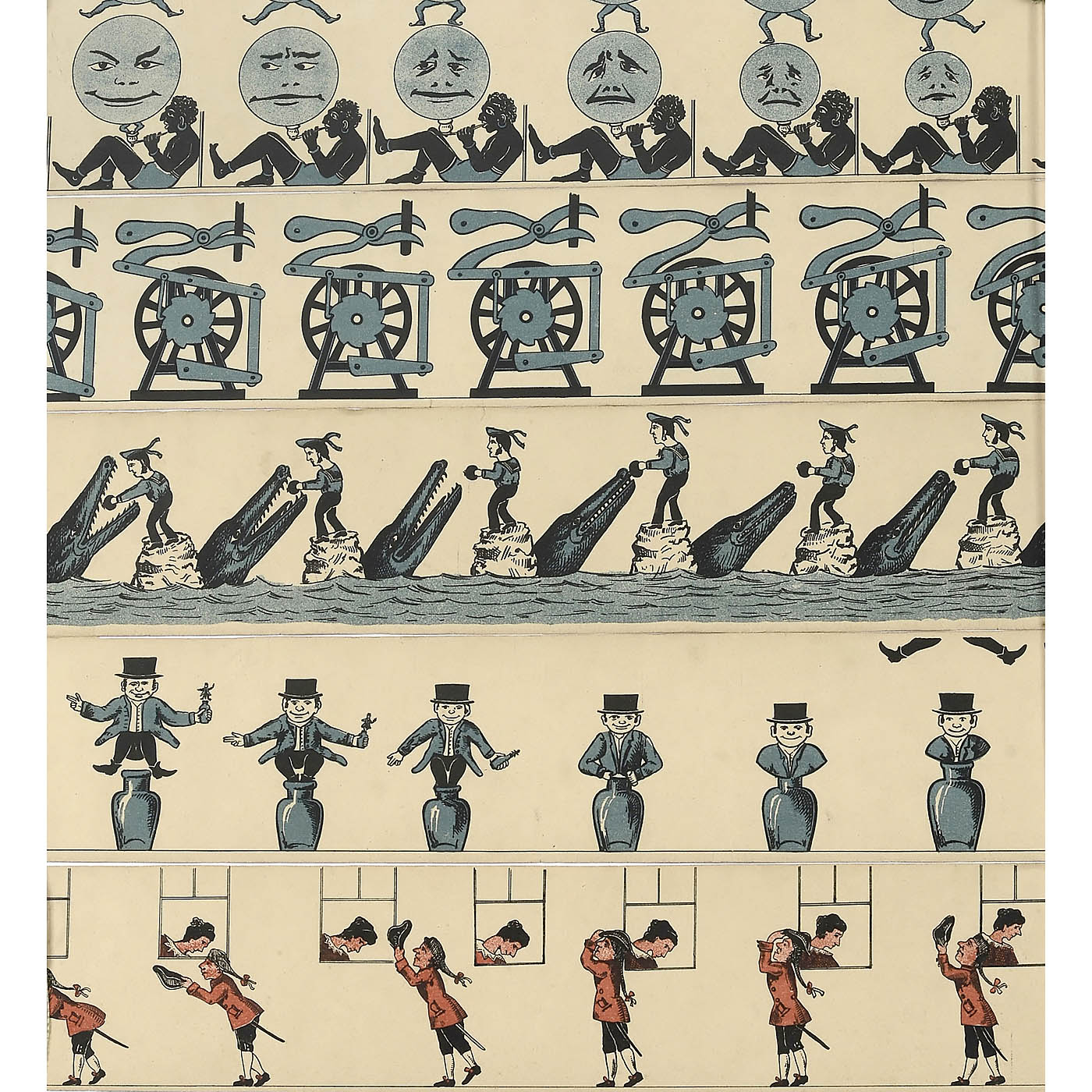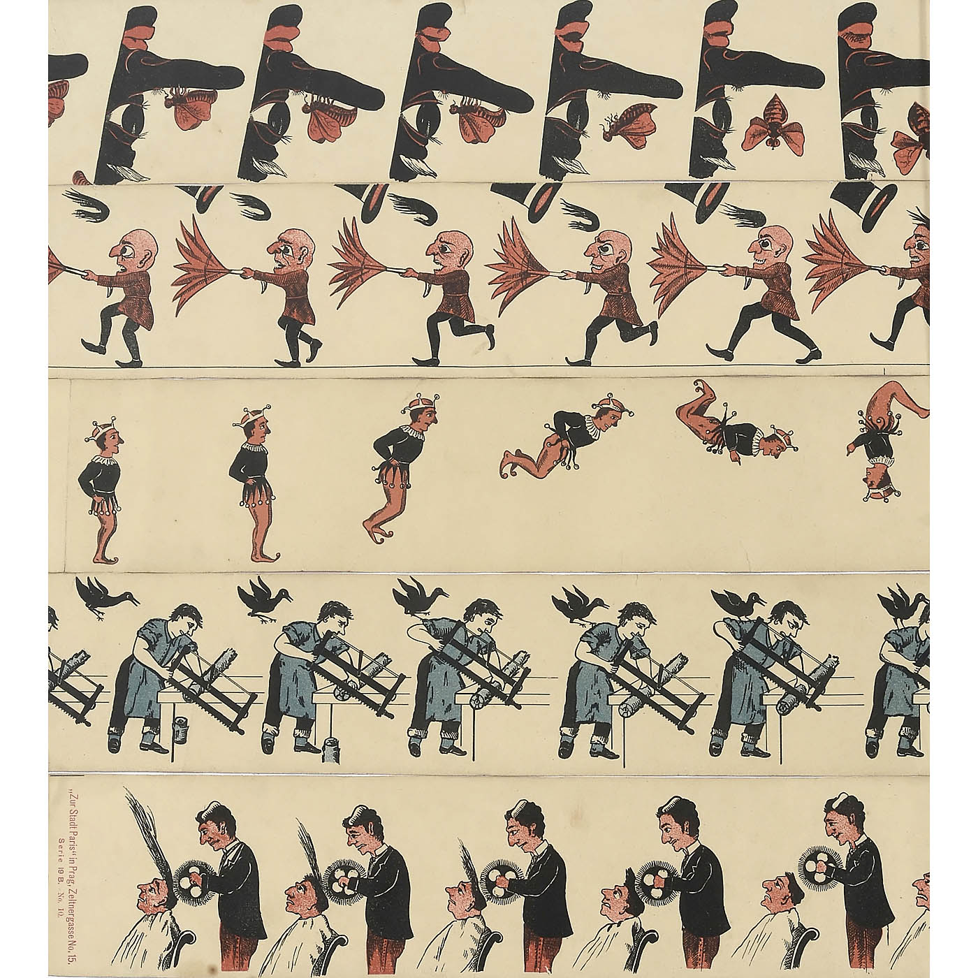 Hof-Galanterie- und Spielwaaren-Haus "Zur Stadt Paris" in Prague. Labeled in Czech and German, drum Ø 11 in., wood base, with 10 different single-sided strips of 35 ½ x 3 ¾ in., height of the Zoetrope: 15 3/4 in. – Very rare!