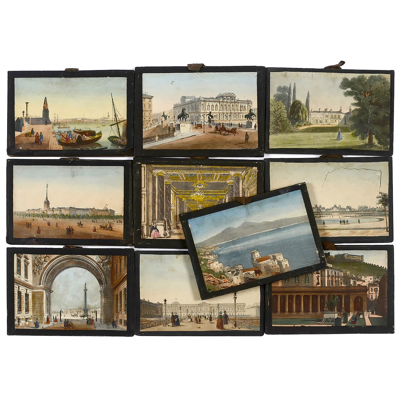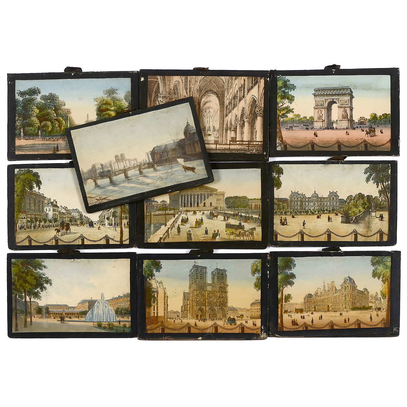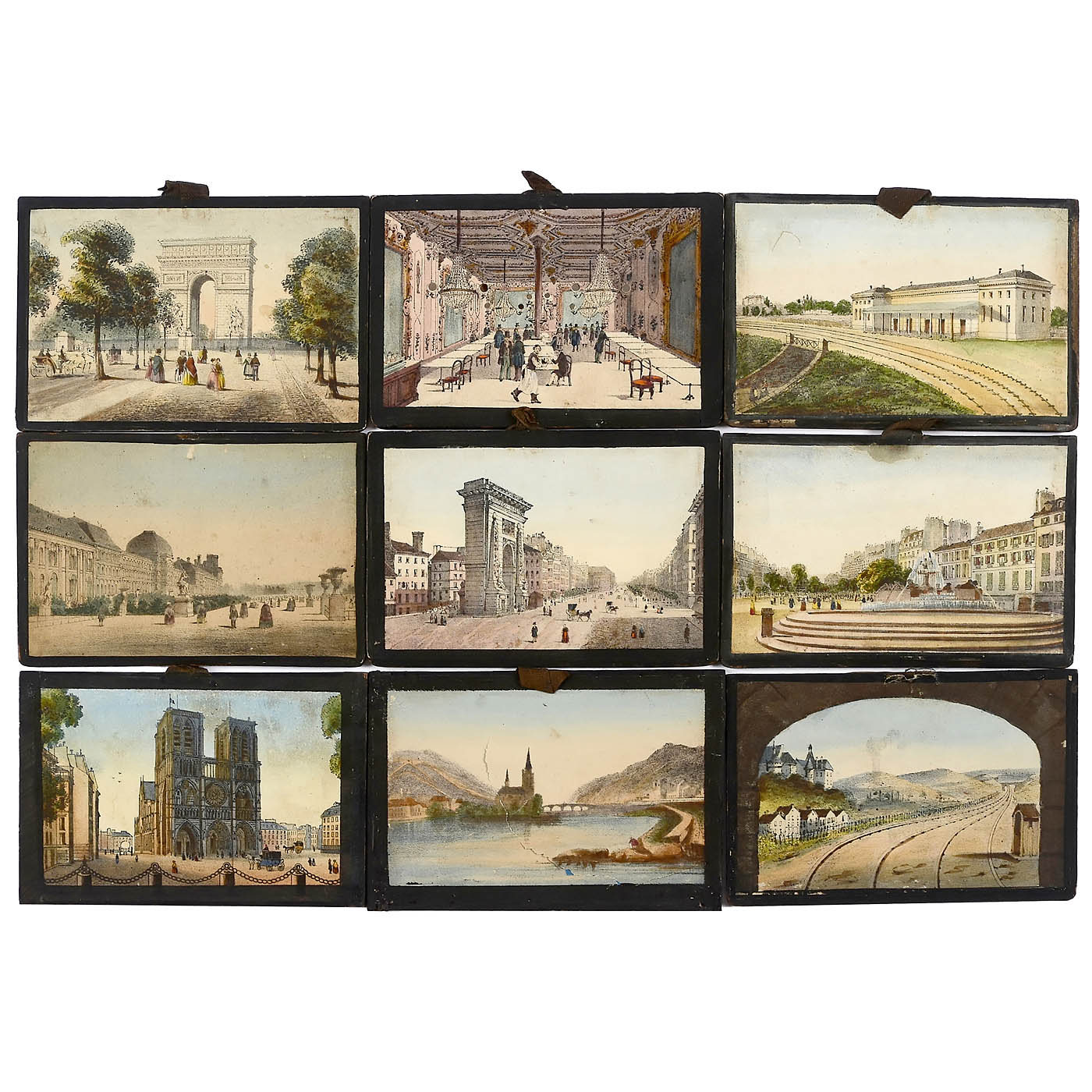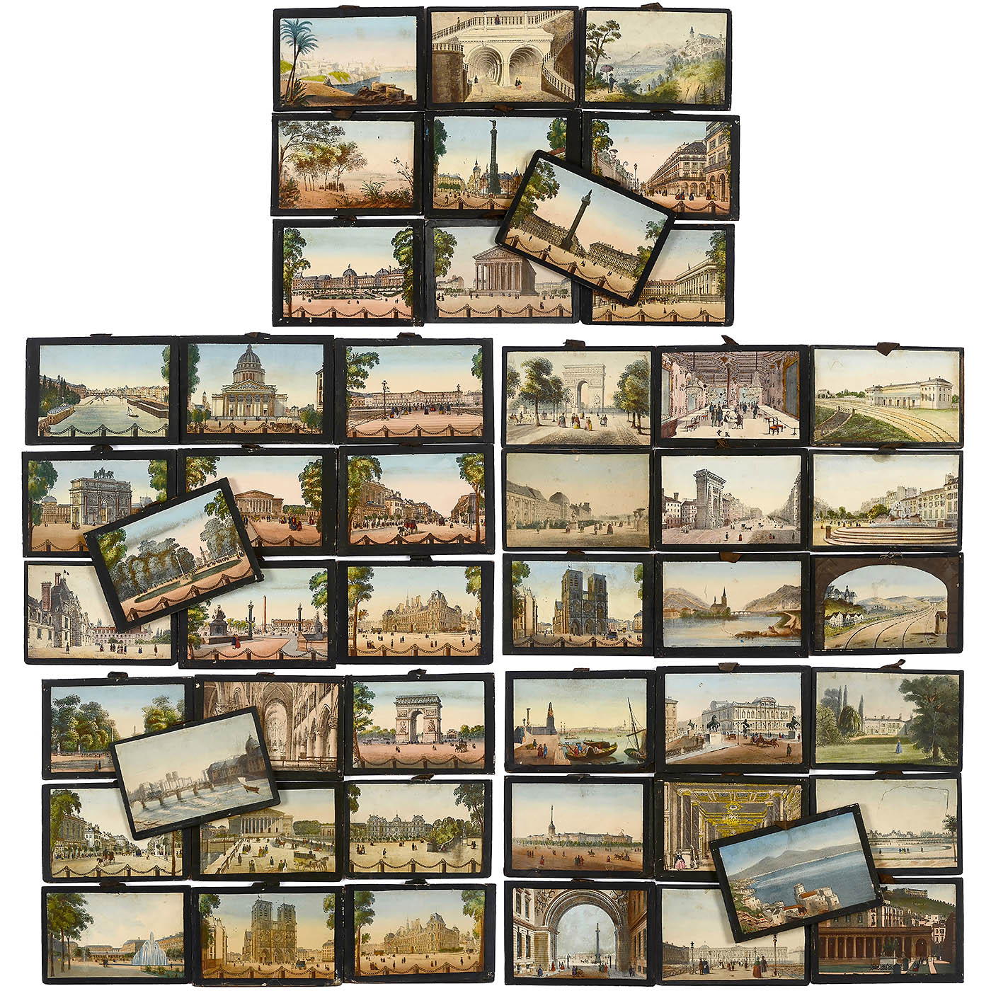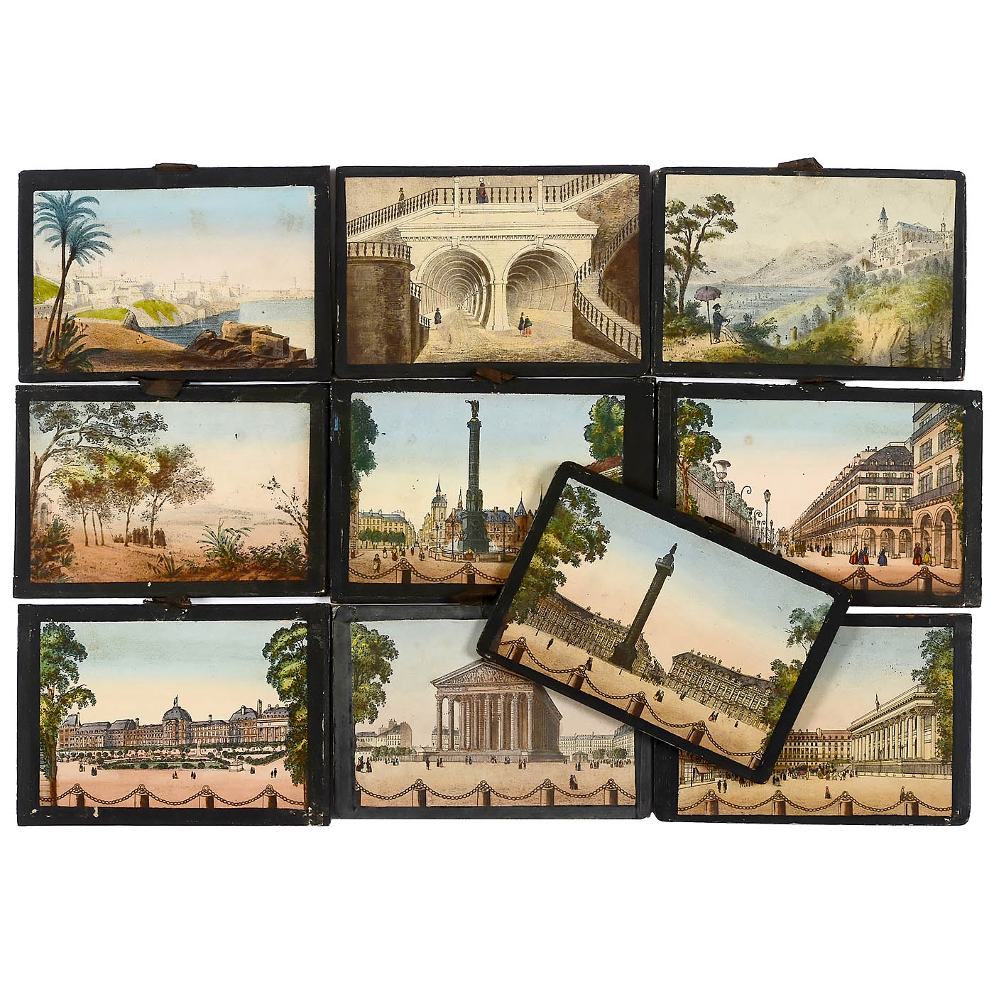 France, all in the format from 14.4 x 9.5 to 14.4 x 10.0 cm, with a short text on the back. All different motifs, no duplicates. 34 x only Paris, 2 x Fontainebleau (one with a tear), Maison de Chateaubriand, 4 x St. Petersbourg, 3 x Naples, Le Chemin de Fer, Alger, Le Tunnel Londres, Bingen sur le Rhin (with a tear) and the most beautiful picture with a painter in front of a castle – Le Peintre devant la nature et dans son ?idole? (difficult to read). All pictures in very good to good condition. – A unique opportunity!