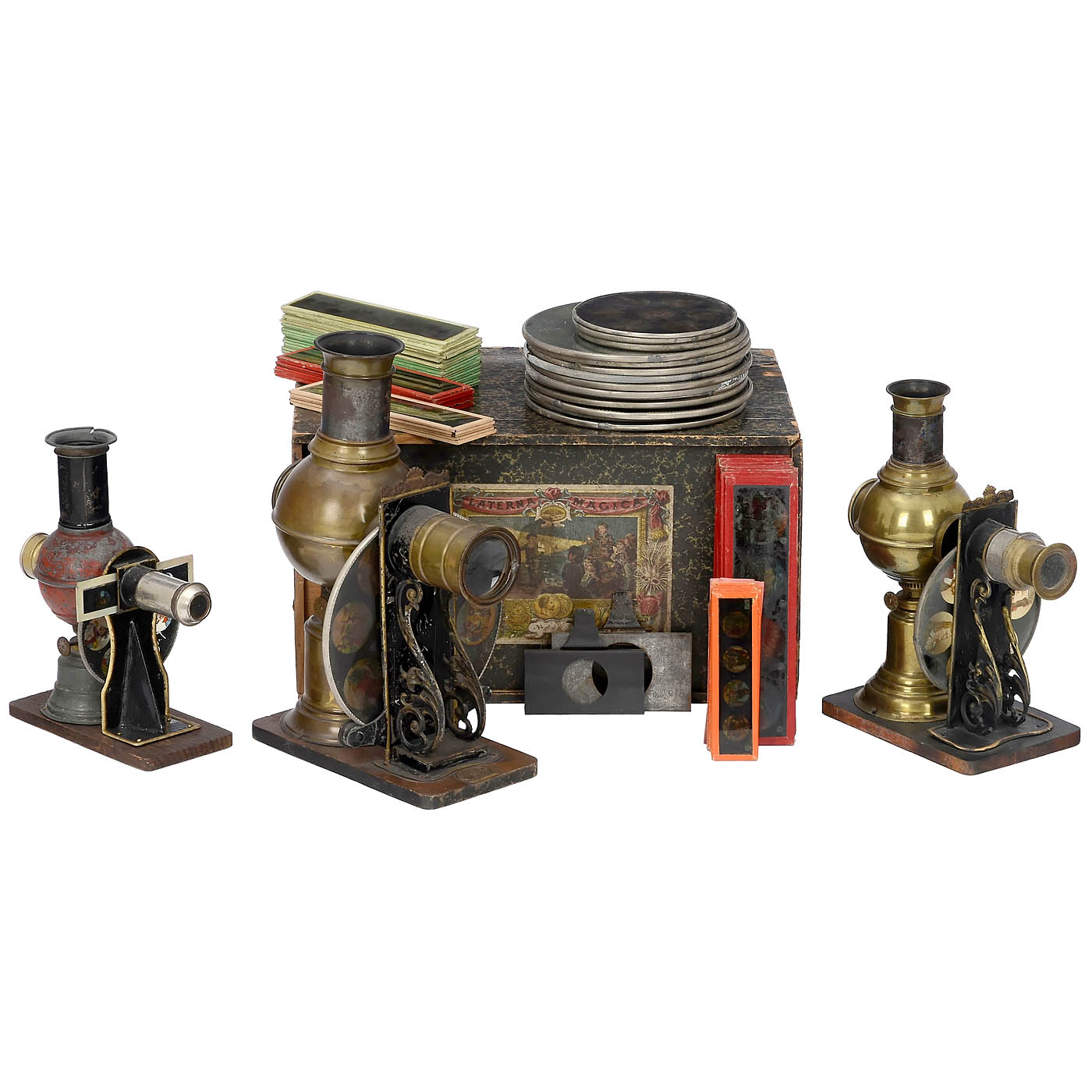 Ernst, Plank, Nuremberg. 1) Climax height 27.5 cm (right strut loose), for 151 mm round discs and using an adapter for 51 mm wide strips, with 12 round discs, 16 strips in 5 cm and box. – 2) Climax height 23 cm, for 11 cm round discs and using an adapter for 43 mm wide strips, with 1 round disc and 34 strips in 4 cm. – And: 3) Climax (by Plank?) height 20 cm, for 85 mm round discs, and for 31 mm wide strips, with 4 round discs and 20 strips in 3 cm.