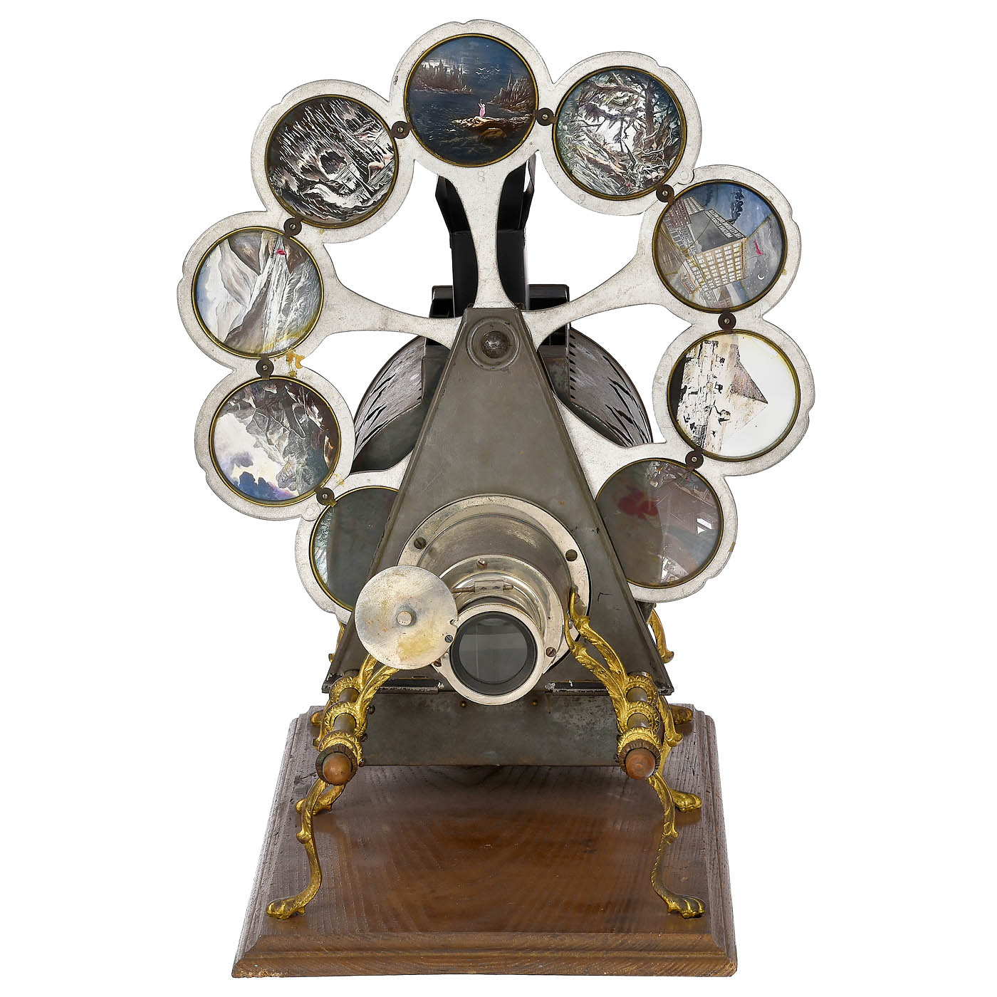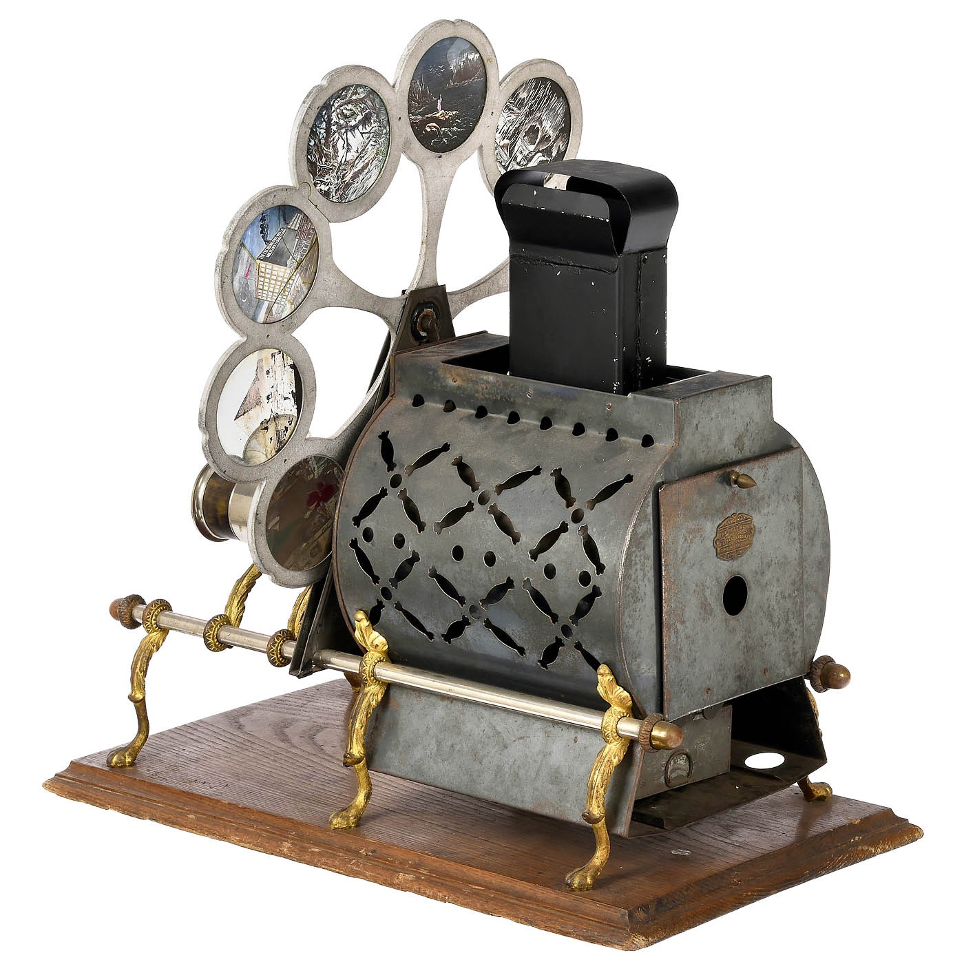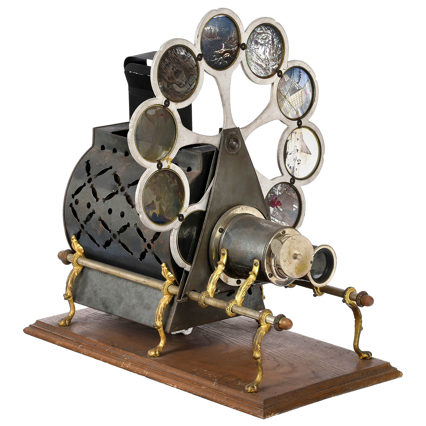 The Pettibone Bros. Mfg. Co., Cincinnati, Ohio/USA. One of the most attractive professional Laterna Magicas with star-shaped rotating holder (retaining screw added) for 10 colored glass pictures of 75 mm Ø, motifs in order of the original from 1890: Pettibone factory with advertisement "Military & Society Goods" with moon and stars in background, flying dragons and snakes in the mangrove jungle, the end of the world with a lamenting hermit, ice age, flood, mountains, fauna & blossoming flora, scholar with folios, alchemist with retort and as the last picture the Cheops pyramid with the Sphinx – 2 slides cracked, dimensions: 53 x 30 x 56 cm on a wooden base, with manufacturer's label on the back, 4-burner (rusty) with chimney (well reconstructed), double condenser held by a plug connection (be careful when transporting), this is an early version of the Sciopticon. – A truly spectacular collector's item and exhibit! Extremely rare!