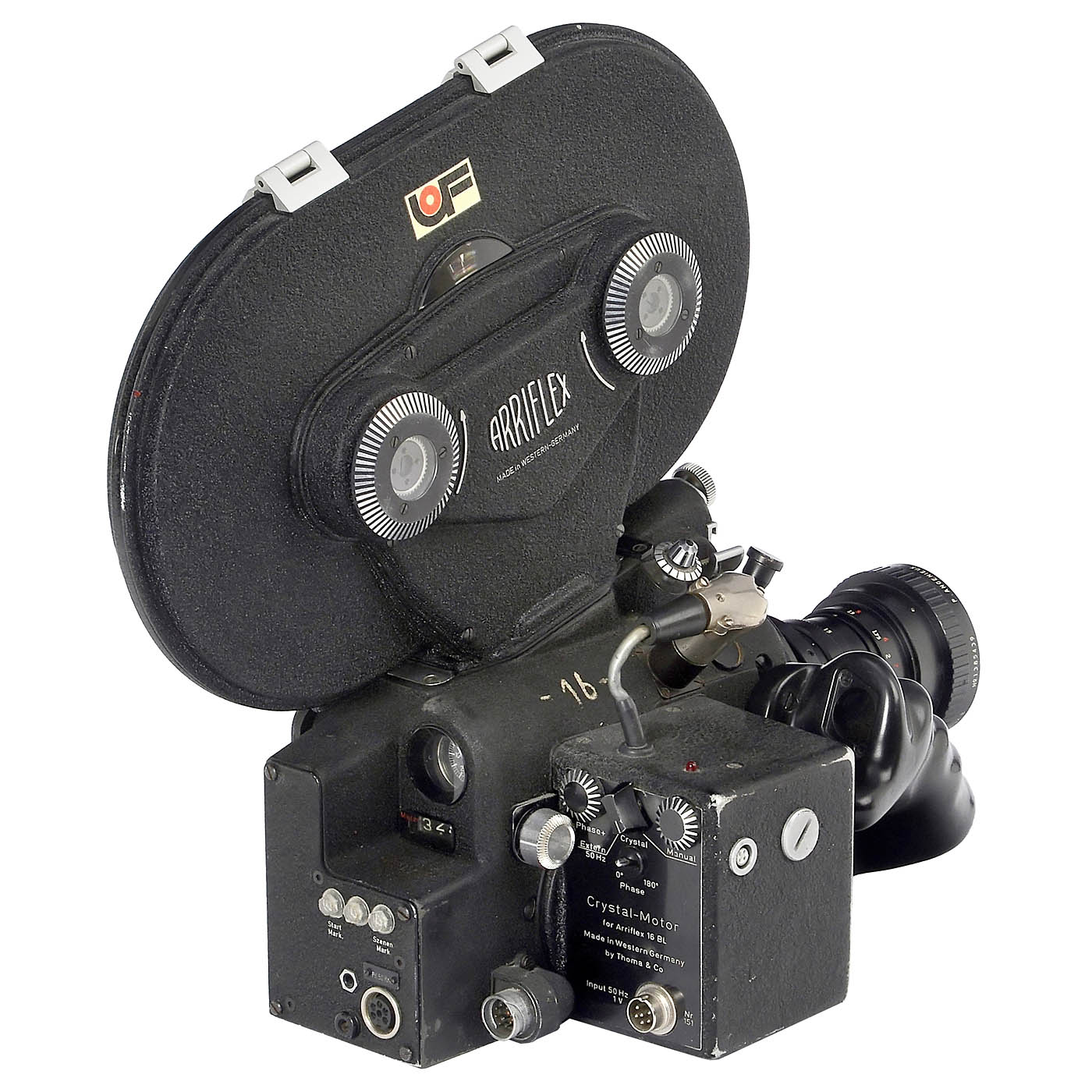 Arnold & Richter, Munich. 16mm film camera for 120m rolls in an attachment cassette. Lens: Angenieux Zoom 2.2/12–120 mm, viewfinder system: SLR with angle magnifier. Gripper mechanism. Electric motor can be switched from synchronous to manual. Attached handle. – The BL 16 was the first low-noise Arriflex for television stations working with film in Europe. – Electrical functions untested.