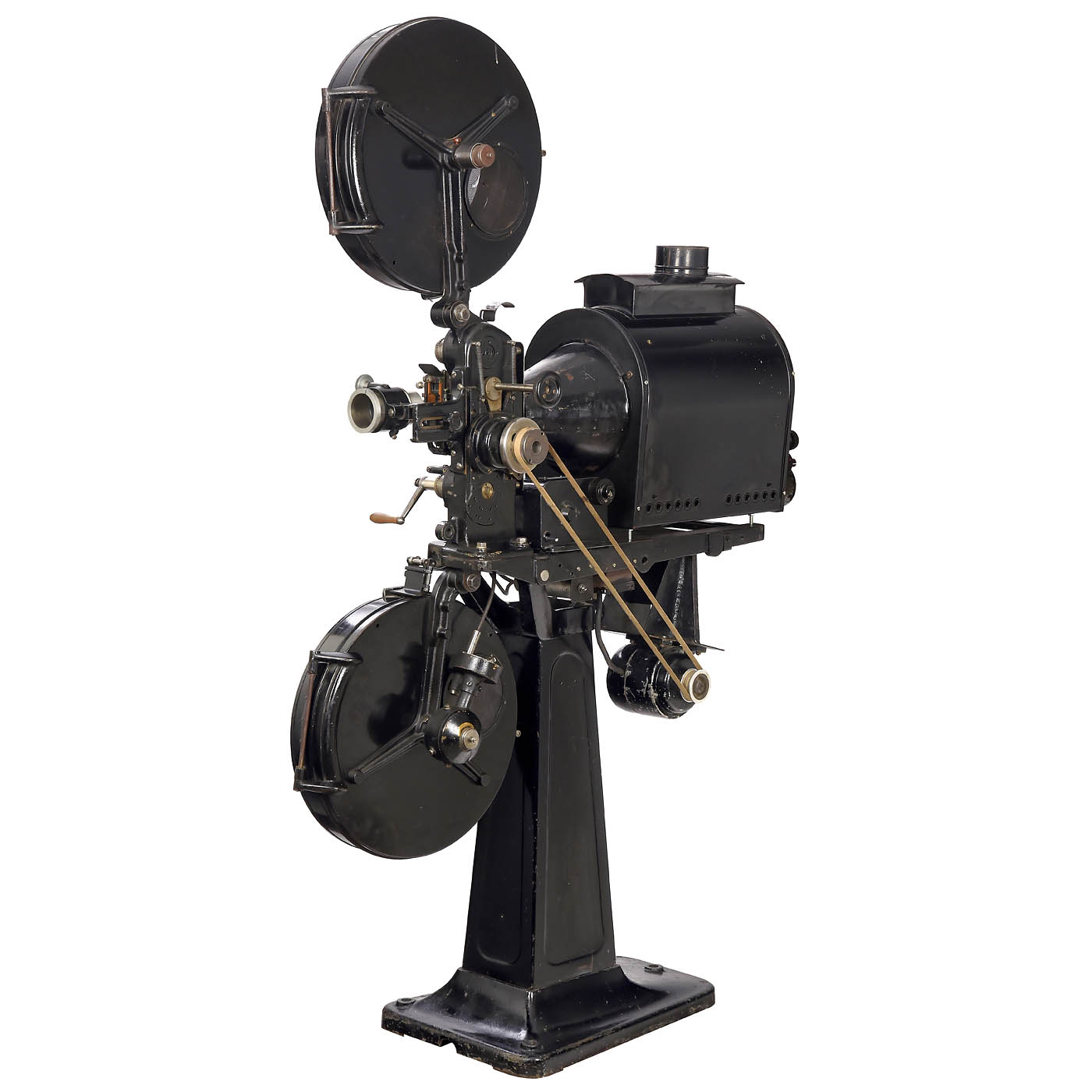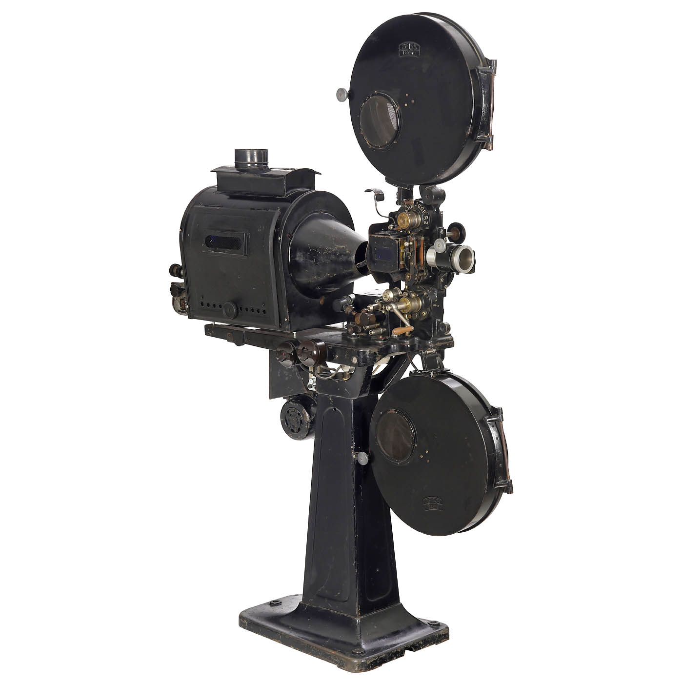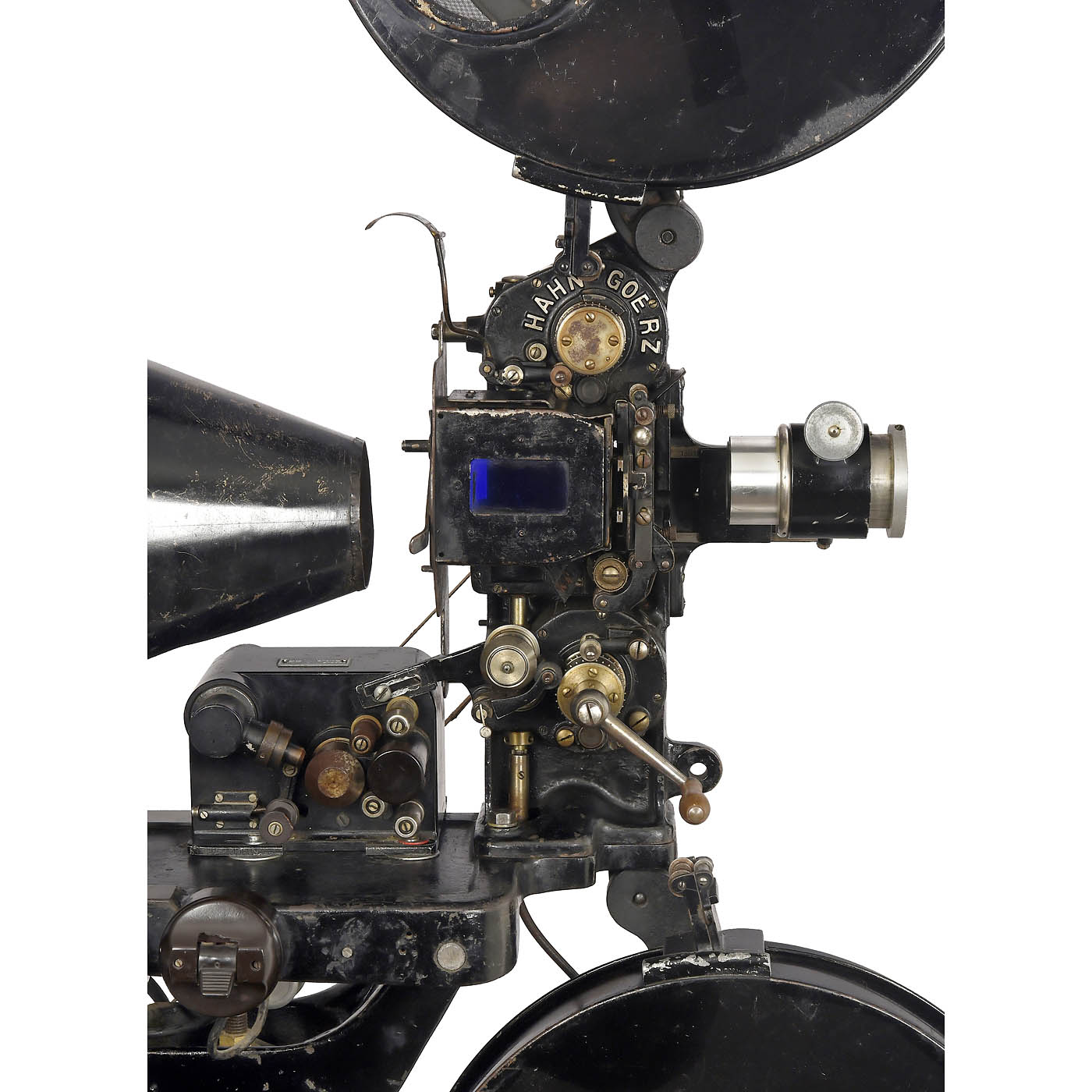 Hahn-Goerz, Kassel, Germany. Projector for 35mm cinema film on 600m reels (2 reels available in fire protection drums). Step switch mechanism with Maltese cross. Drive either via handcrank or electric motor. Lens unknown. Projection head with Hahn-Goerz label and the fire protection drums with Zeiss Ikon, which is no contradiction. As of 1924, the Hahn works in Kassel belonged to Zeiss Ikon. Both names were used simultaneously. This silent film projector was modernized c. 1932 with a sound film optical sound scanner. – In addition: Carbon arc lamp Jovo – Automatic III from Jovo, Frankenhausen. – A rare silent and sound film projector. Electrical functions not tested.