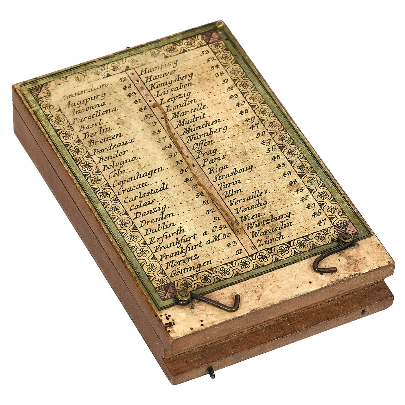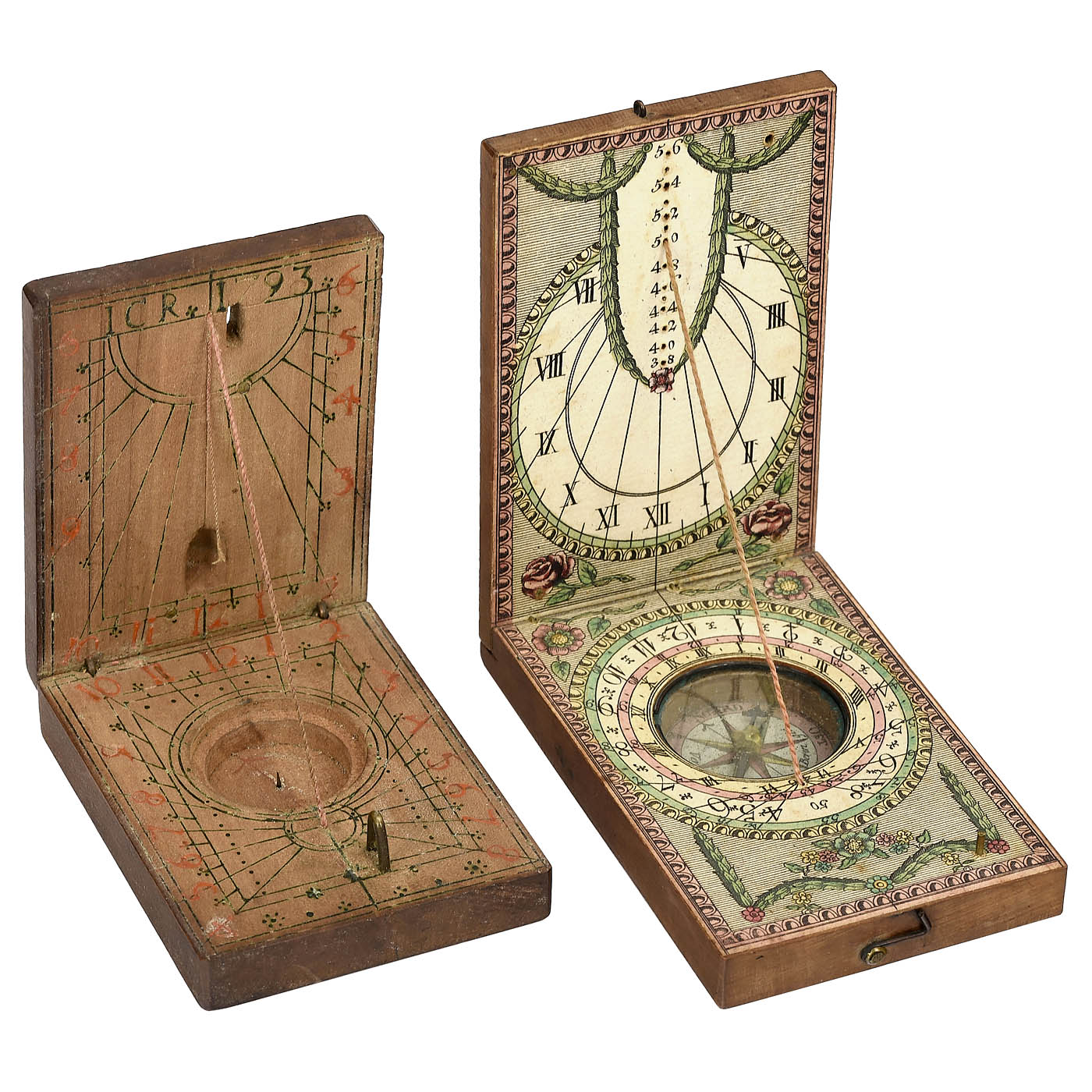 1) David Beringer, Nuremberg. Boxwood with brass hinges and hooks, printed list of latitudes of 46 prominent European cities on the lid, interior with colored copperplates with floral pattern, Roman numerals, horizontal dial with central compass with Arabic numerals, thread gnomon, dimensions 2 1/5 x 3 ½ x ¾ in. – And: 2) Marked: ‘ICR 1793’, boxwood, hand-drawn lines and numerals, without compass, dimensions 3 x 2 1/5 x 3/5 in.