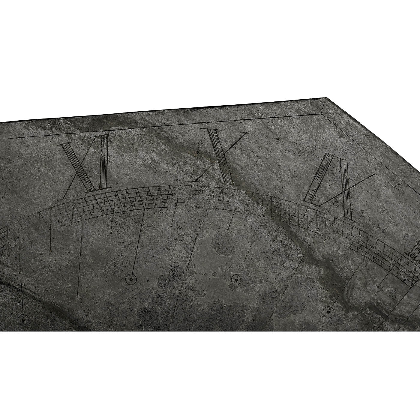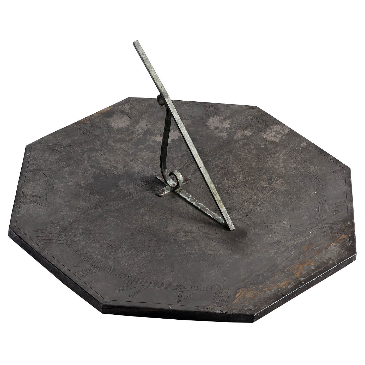 Octagonal slate plate, engraved Roman numerals, wrought and patinated gnomon, 21 x 21 in.