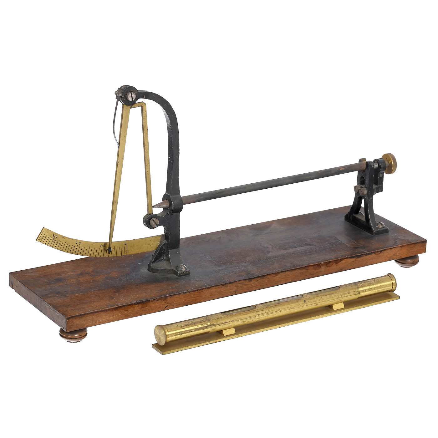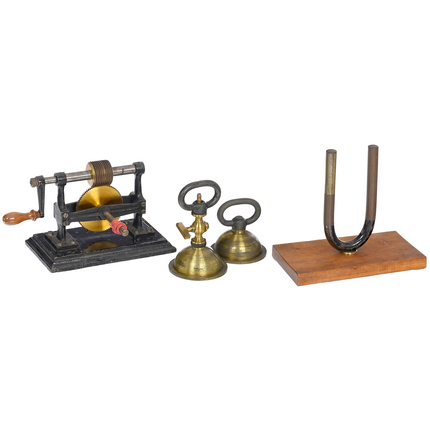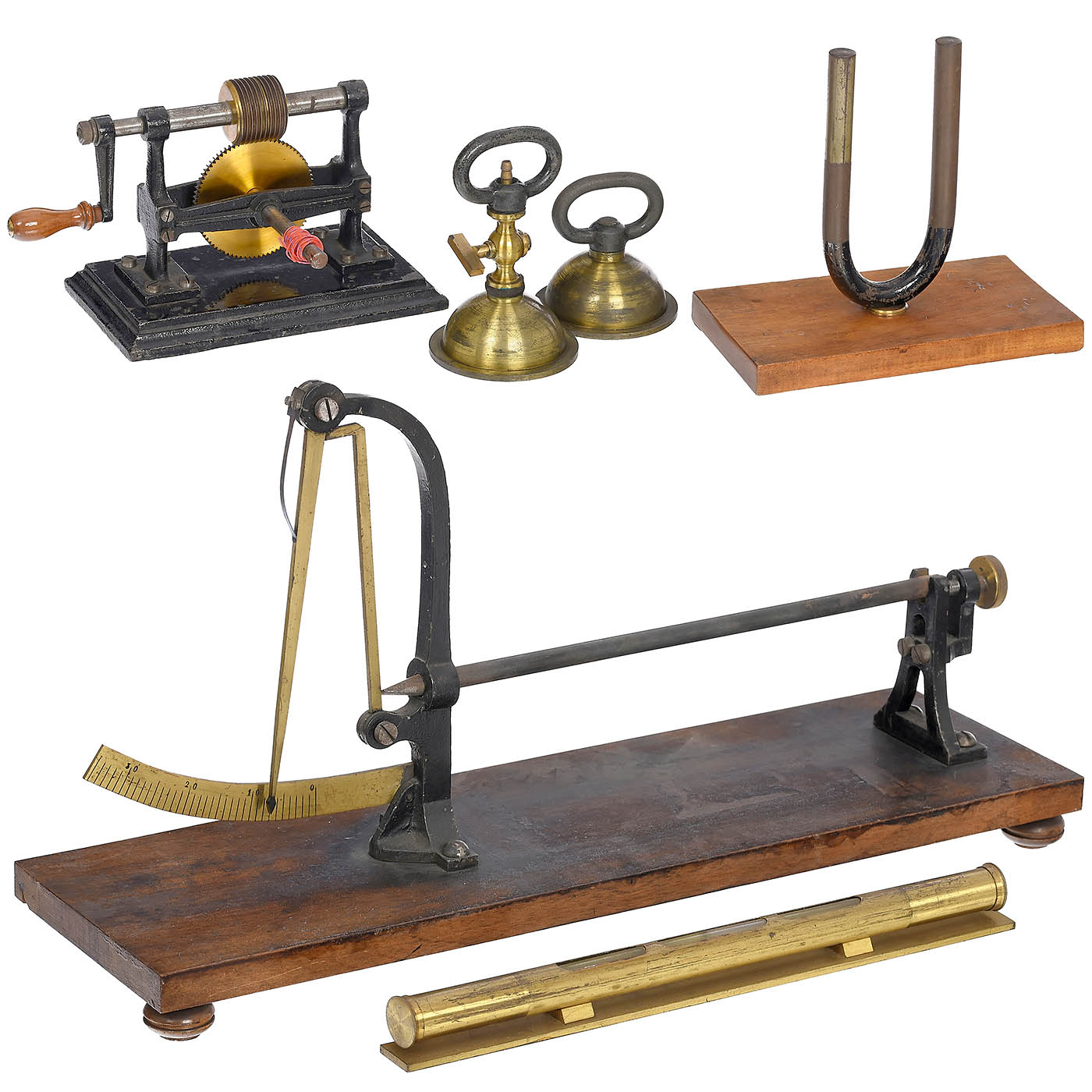 1) Magdeburg hemispheres, brass, with 2 handles. – 2) Windlass, machine model, brass worm and gear wheels, with handcrank. – 3) Pyrometer, for determining linear expansion, with one metal rod. – 4) Horseshoe magnet, on wooden plate. – And: 5) Spirit level, brass, length 10 in., in metal container, working.