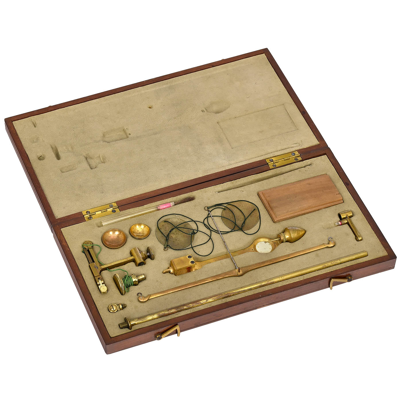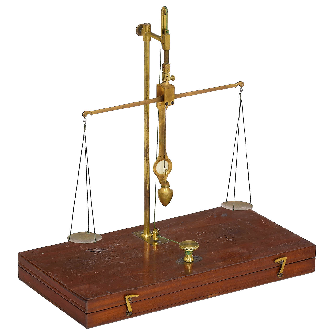 Precision scales/field scales, attributed to: Workshop of Wilhelm Friedrich Lingke (mining mechanic in Freiberg/Saxony). The scales were used for analysing minerals, measuring range between 0.1 milligrams and 20 grams, lacquered brass, in mahogany case with goatskin lining.
