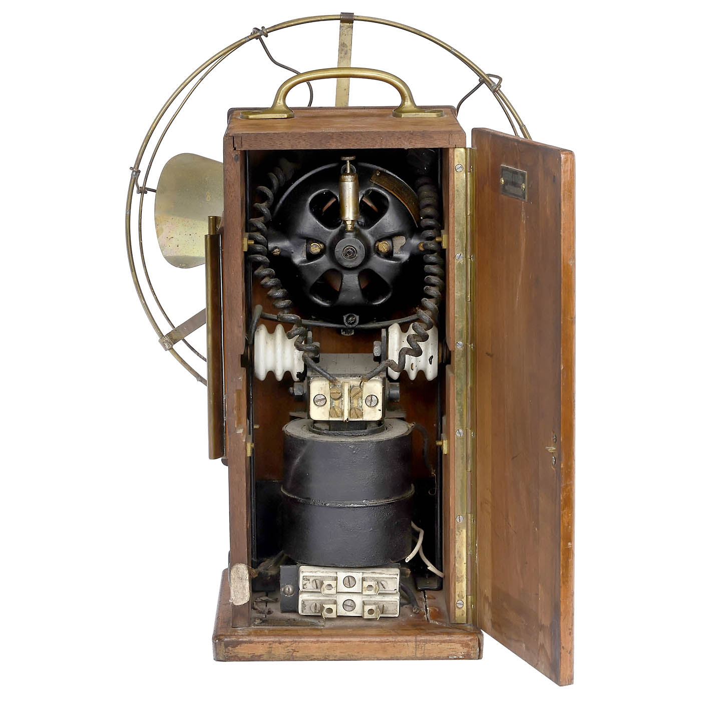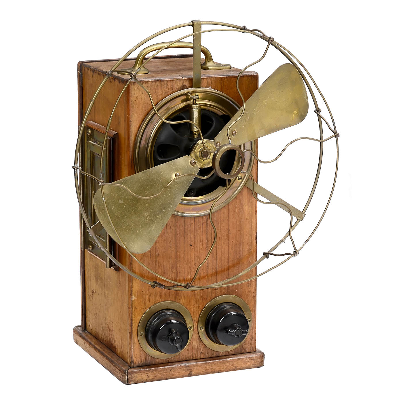 No. 1885, in walnut case, 220 volts, 2 brass blades in brass cage, high-voltage transformer in lower part (110 to 6000 volts), wiring not complete, total height 17 ½ in.