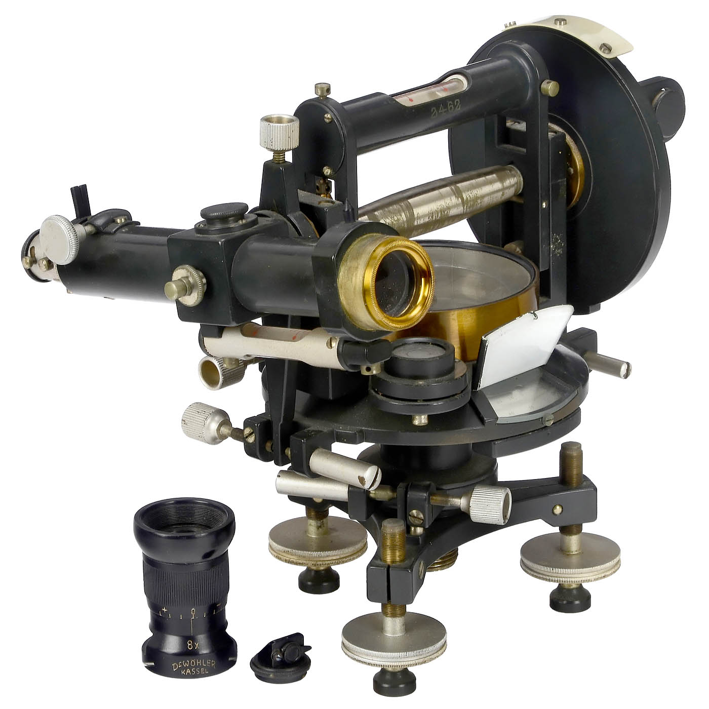 Former Warkentin & Krause, Leipzig. Serial no. 2462, original blackened and lacquered brass, compass, Ø 3 in., silver-plated horizontal 360° graduation, telescope with rack-and-pinion focussing, length 6 4/5 in., on adjustable tripod stand, 3 bubble levels, with further parts in matching wood case.