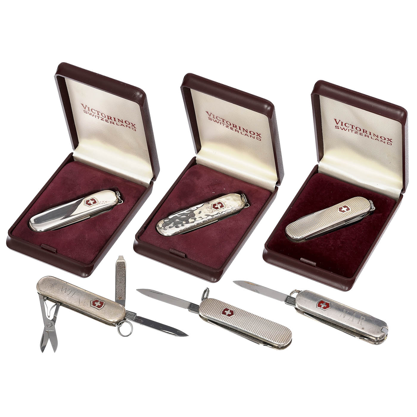 Victorinox, Switzerland. 1) Smooth, with box. (3+/–) 2) Rough, with box. (2-/–) 3) Alox-like, with box. (2-/–) – And: 4–6) With engravings and signs of use. (3-/–)