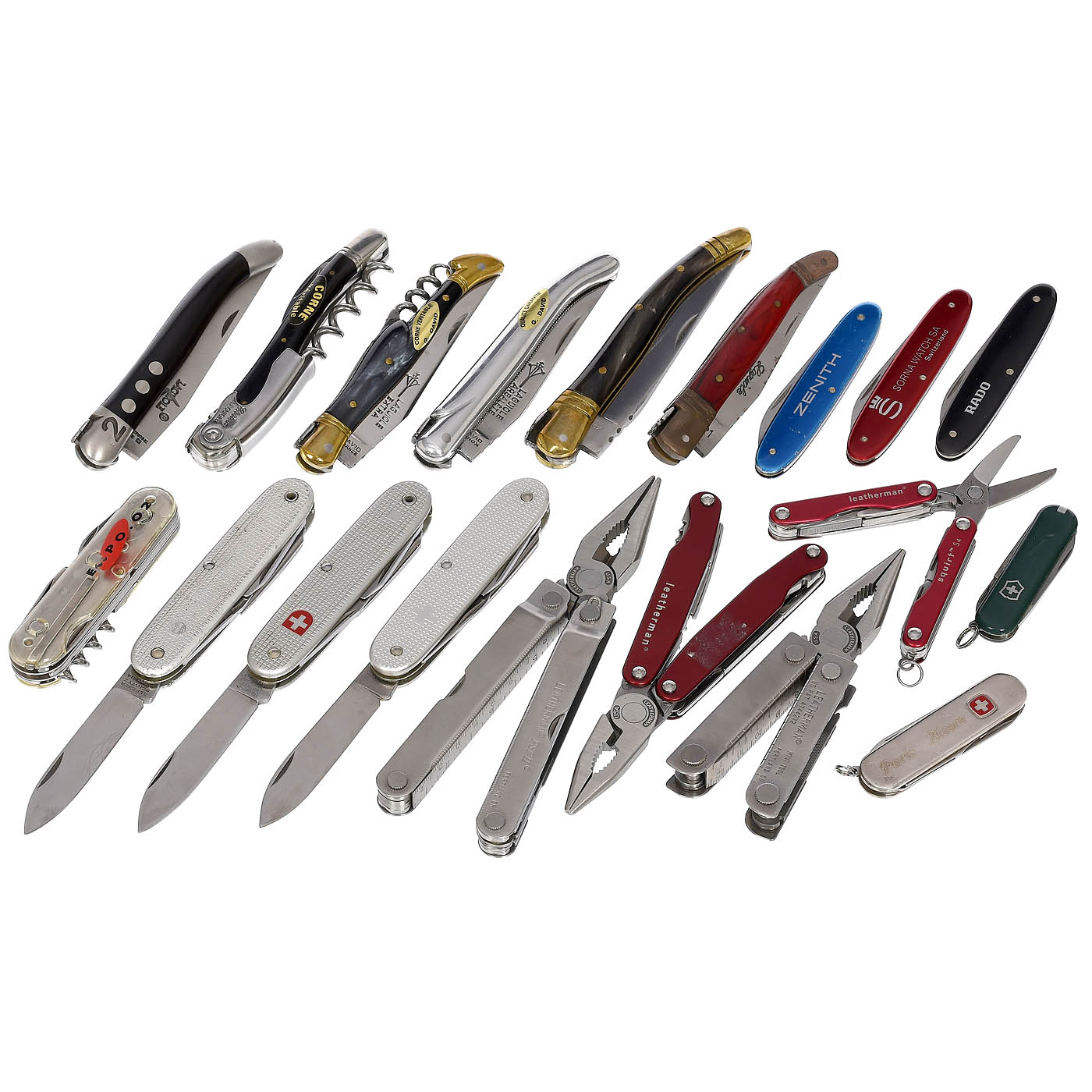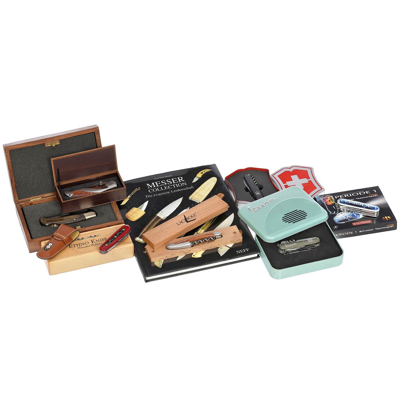 1) 7 Laguiole knives, one of them in a wooden presentation box. – 2) Alox soldier's knives: l x Elsener, very early knife, no. 66; 1 x Wenger no. 88; 1 x Victorinox. – 3) Vespa multifunction knife, with tin box in turquoise color of the 50s, like new. – 4) Wenger knife with transparent handles. – 5) Victorinox special edition "Spaceship Surprise Period 1", with packaging, absolutely as new. – 6) Victorinox Limited Edition "Ethno Knife" by Michel Jordi, No. 092/999, with matching case and light wooden box, probably never used. – 7) Wenger knife with transparent handles. – 8) Wenger knife with sterling silver (925) handles, engravings: Paris, Bievre, Zurich, Liechtenstein, with signs of use. – 9) Victorinox knives, in plastic box in the shape of the Swiss coat of arms. – 10) 4 small Victorinox knives. – 11) Large Herbertz knife, no. 203312, in wooden presentation box, probably never used. – 12) Large Herbertz one-handed knife, 420 steel, blade engraving "Wild und Hund", like new. – 13–16) Leatherman Multitools: l x PSTII, 1 x Mini Tool, l x Juice C2 and 1 x Squitt S4, all like new! – And: 17) Book: "Messer Collection. Die exquisite Leidenschaft " by Jean-Noel Mouret with over 140 pages.