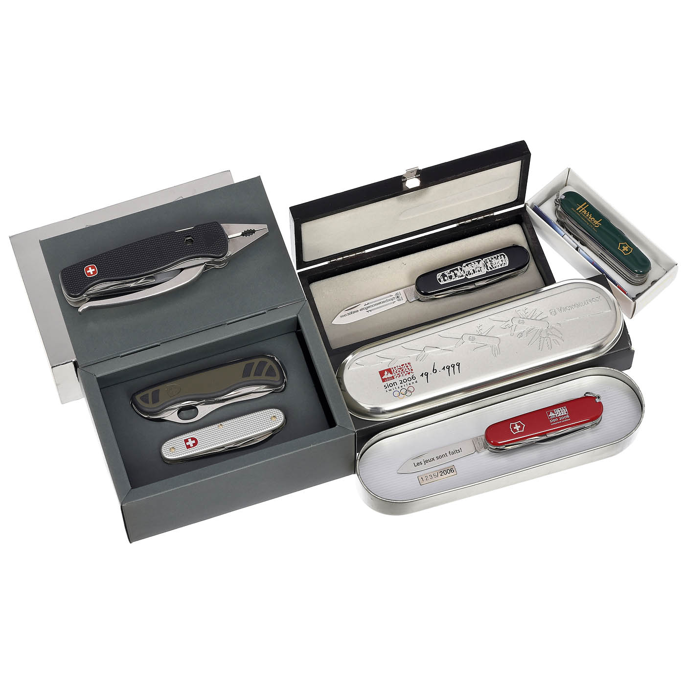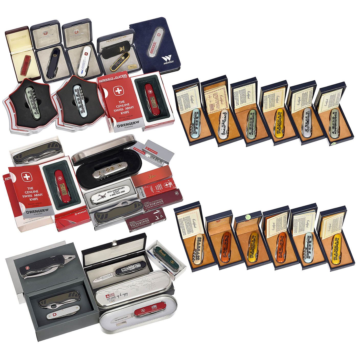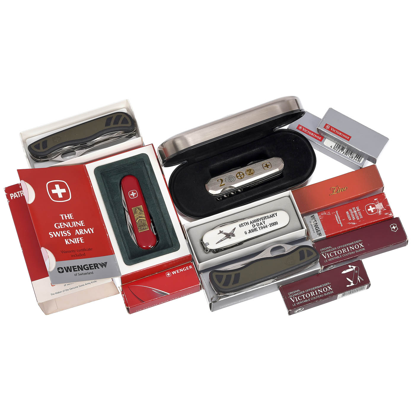 1) Victorinox ‘Sion 2006’, no. 1235/2006, in metal box. – 2) Victorinox ‘Serie limitata Set Militare 2009’, no. 493/999, with box and certificate. – 3–16) Wenger, the collection ‘Das Leben’, 1 x Die Geburt (15884) no. 152; 3 x Die Kindheit (15885) no. 23/28/567; 3 x Die Jugendzeit (15886) no. 22/102/564; 3 x Die Hochzeit (15887) no. 102/556/1533; 2 x Das Familien-Leben (15888) no. 21/566; 2 x Das Alter (15889) no. 126/505; all with box or tin, 12 of them with certificate. – 17) Victorinox collector's knife officer's model ‘700 Jahre Eidgenossenschaft 1291–1991’ in wooden box. – 18) Wenger ‘Swiss Millenium’ no. 122, in metal box with certificate. – 19–20) Wenger ‘Patrouille des Glaciers Series’ 1998, with box. – 21) Wenger ‘Swiss Symbol’ 700 years of the Swiss Confederation, with box. – 22) Wenger ‘700 years Confoederatio Helvetica’, with box. – 23) Wenger ‘8th Swiss Knife Show 1990’, with box. – 24) Wenger ‘Nostalgie Istanbul Orient Express’, with box. – 25) Victorinox Handyman ‘Harrods Knightsbridge 150 Years’, green shell, with packaging. – 26) Wenger multitool, heavy-duty version, with pliers, knife and other functions. – 27–28) Victorinox one-handed knife, 8461, green, with packaging. – 29) Victorinox men's knife, rectangular, dark red/gold, approx. 5.5 cm long, with box. – 30) Victorinox ‘D'Day 6 June 1944–2009’, white bowls, 9 cm, with packaging. – 31) Victorinox ‘Zino... from the house of Davidoff’, black bowls, 9 cm, with packaging. – And: 32–37) Other smaller Victorinox and Wenger knives, with box. – The knives are in very good to mint condition. Most of them have probably never been used.