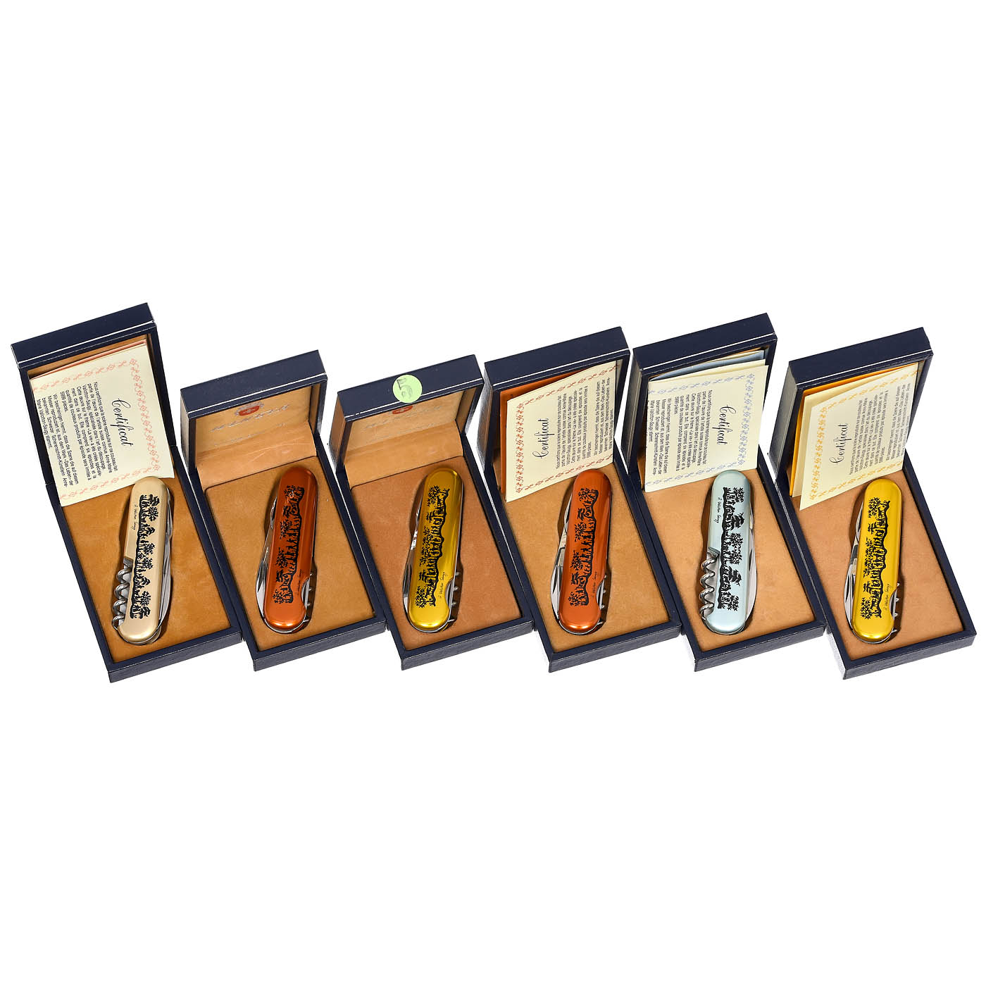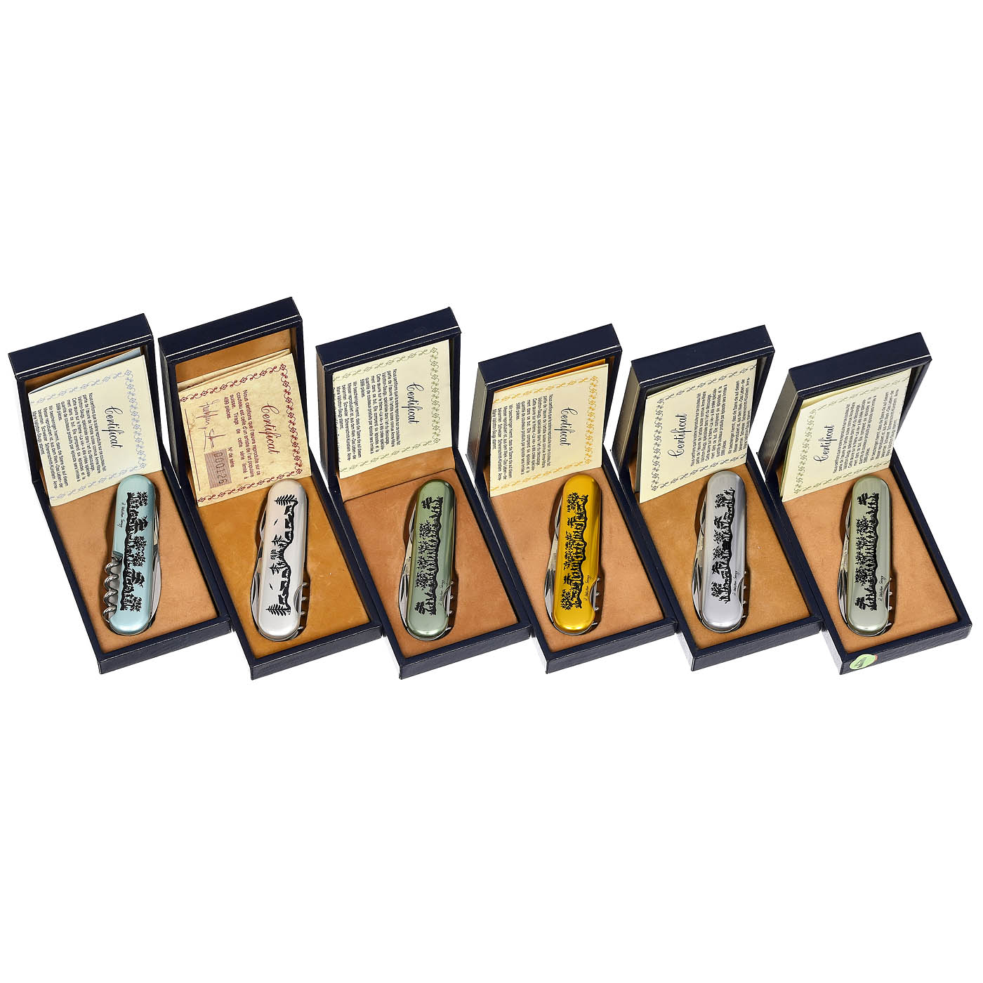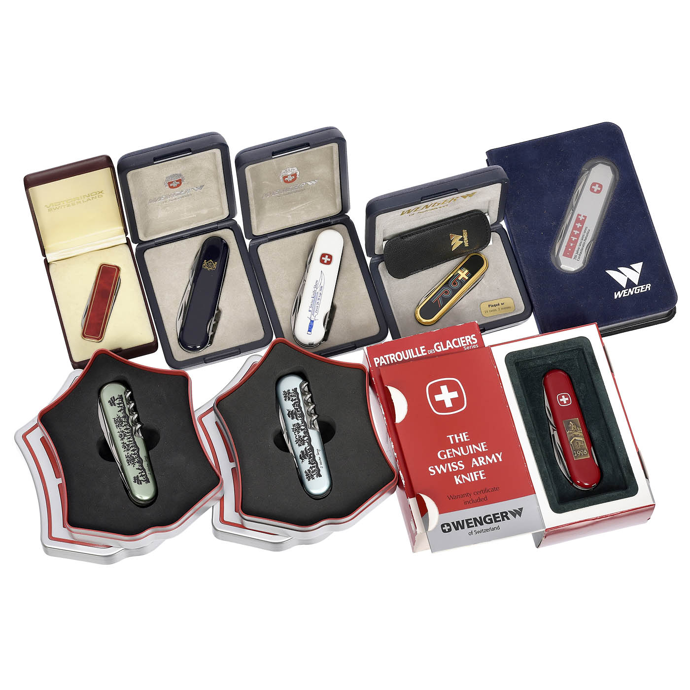 1) Victorinox ‘Sion 2006’, no. 1235/2006, in metal box. – 2) Victorinox ‘Serie limitata Set Militare 2009’, no. 493/999, with box and certificate. – 3–16) Wenger, the collection ‘Das Leben’, 1 x Die Geburt (15884) no. 152; 3 x Die Kindheit (15885) no. 23/28/567; 3 x Die Jugendzeit (15886) no. 22/102/564; 3 x Die Hochzeit (15887) no. 102/556/1533; 2 x Das Familien-Leben (15888) no. 21/566; 2 x Das Alter (15889) no. 126/505; all with box or tin, 12 of them with certificate. – 17) Victorinox collector's knife officer's model ‘700 Jahre Eidgenossenschaft 1291–1991’ in wooden box. – 18) Wenger ‘Swiss Millenium’ no. 122, in metal box with certificate. – 19–20) Wenger ‘Patrouille des Glaciers Series’ 1998, with box. – 21) Wenger ‘Swiss Symbol’ 700 years of the Swiss Confederation, with box. – 22) Wenger ‘700 years Confoederatio Helvetica’, with box. – 23) Wenger ‘8th Swiss Knife Show 1990’, with box. – 24) Wenger ‘Nostalgie Istanbul Orient Express’, with box. – 25) Victorinox Handyman ‘Harrods Knightsbridge 150 Years’, green shell, with packaging. – 26) Wenger multitool, heavy-duty version, with pliers, knife and other functions. – 27–28) Victorinox one-handed knife, 8461, green, with packaging. – 29) Victorinox men's knife, rectangular, dark red/gold, approx. 5.5 cm long, with box. – 30) Victorinox ‘D'Day 6 June 1944–2009’, white bowls, 9 cm, with packaging. – 31) Victorinox ‘Zino... from the house of Davidoff’, black bowls, 9 cm, with packaging. – And: 32–37) Other smaller Victorinox and Wenger knives, with box. – The knives are in very good to mint condition. Most of them have probably never been used.