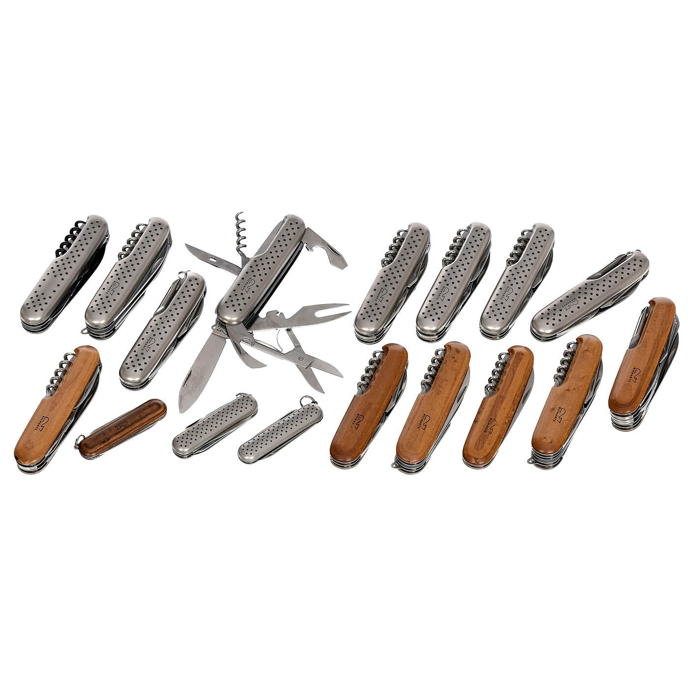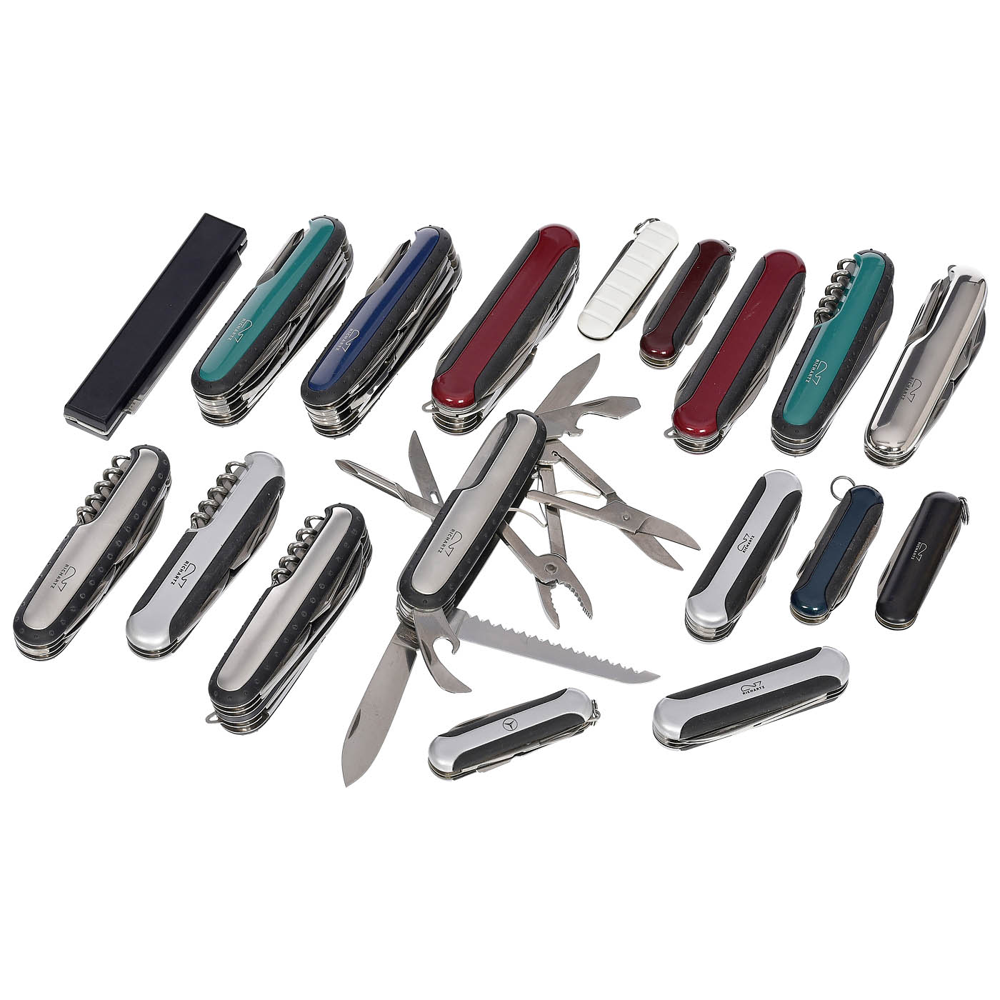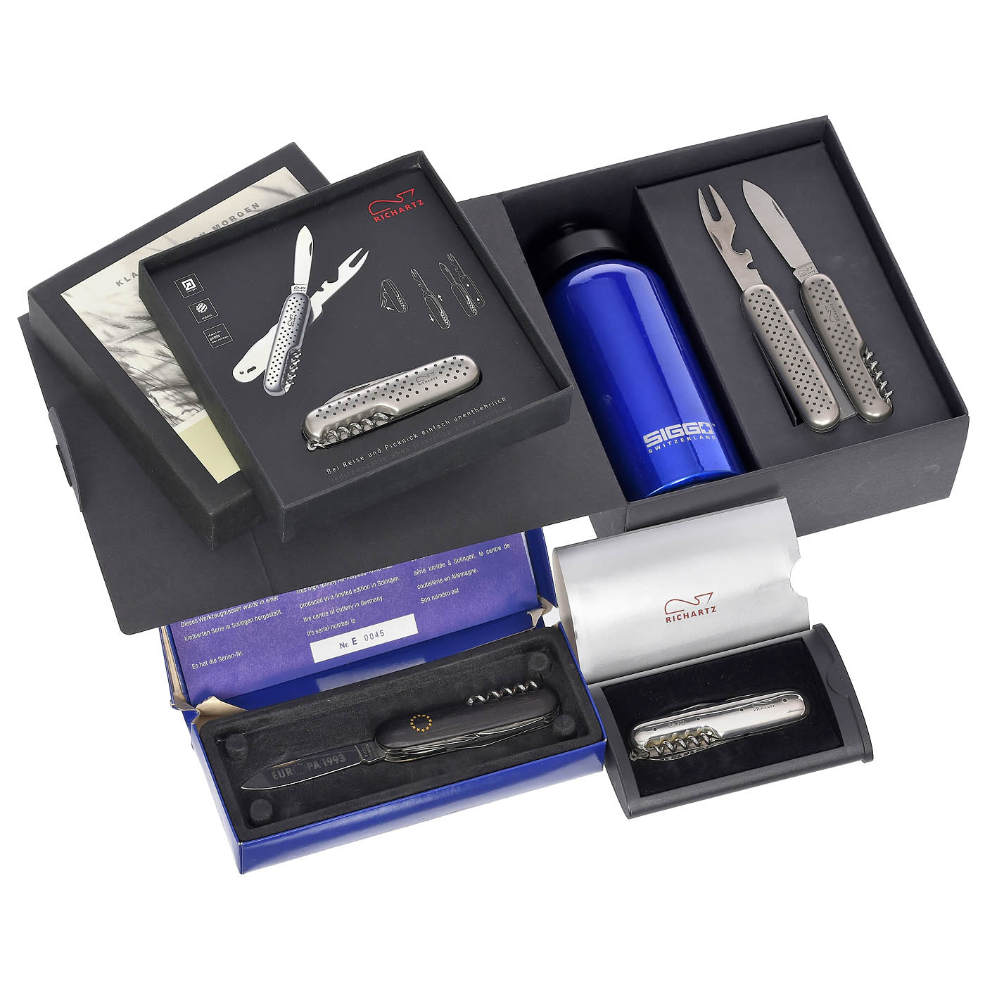 Solingen, Germany. 39 beautiful, interesting and partly rare pocket knives, mostly in very good and mint condition! 1) Special model with 925 sterling silver handles, with box. (2/–) – 2) Europa 1993, special edition with wooden handles, limited, with box. (2-/–) – 3) Picknick with Sigg drinking bottle, new, probably never used, in original presentation box. (2+/–) – 4) Picknick in decorative box. (2+/–) – 5) 10 multifunctional knives with non-slip knobs, most unused, like new! Different sizes, one with black blades. (2-/–) – 6) 7 multifunctional knives with non-slip side strips, various sizes, unused, like new. (2/–) – 7) 7 multifunctional knives with wooden handles, various sizes, as new. (2/–) – 8) 8 multifunctional knives, colored, various sizes. (2–3/–) – And: 9–11) Blade with plastic shaft and 2 miniature knives. (2–3/–)
