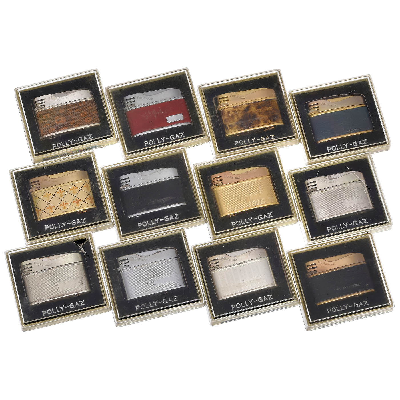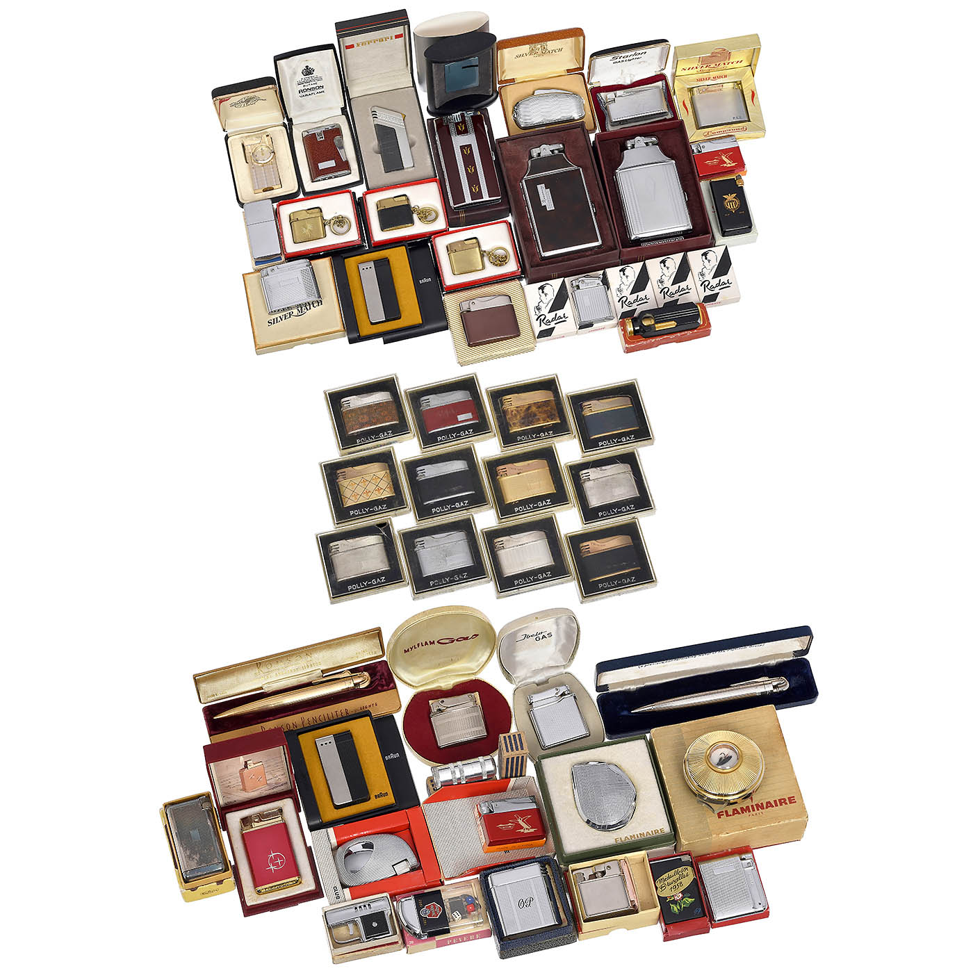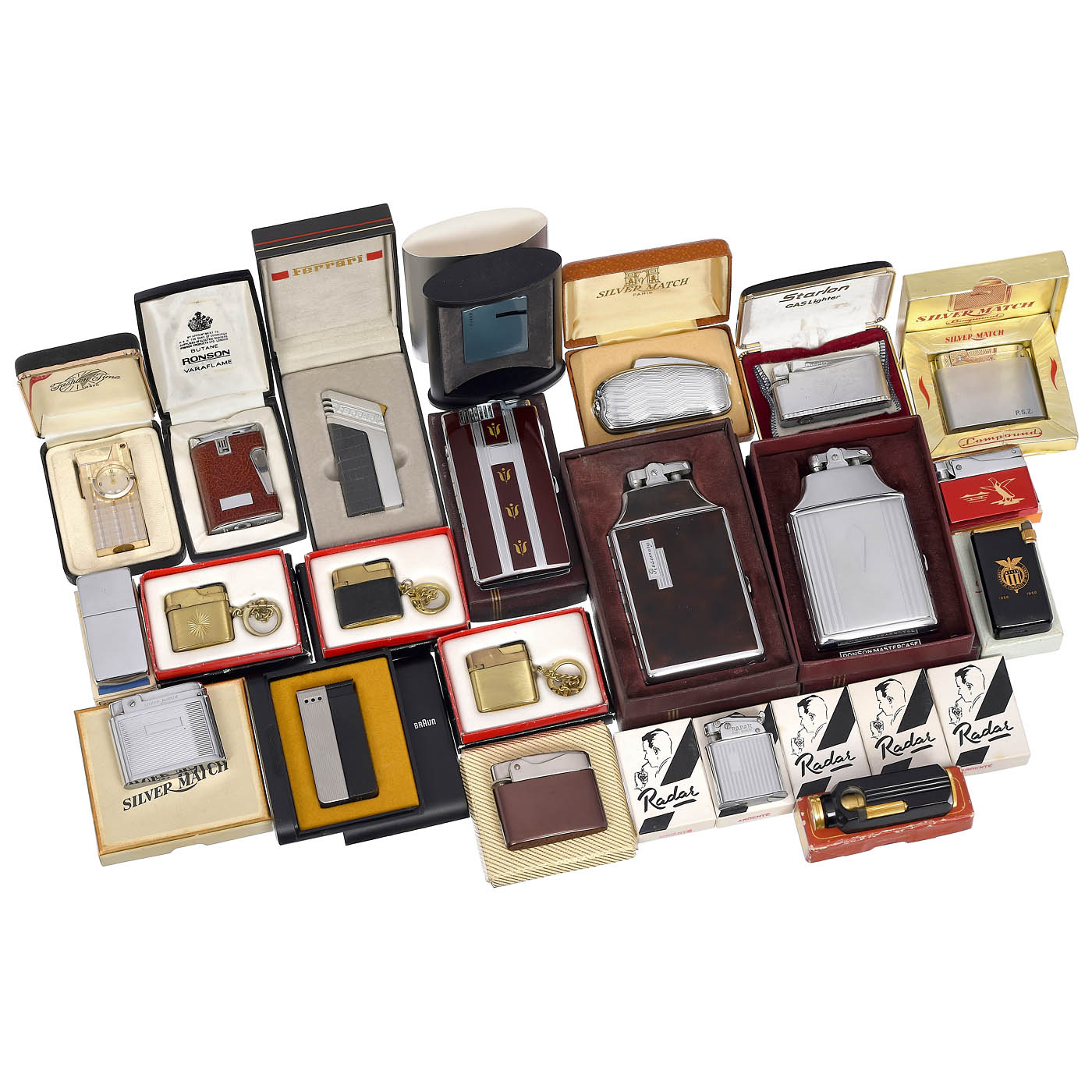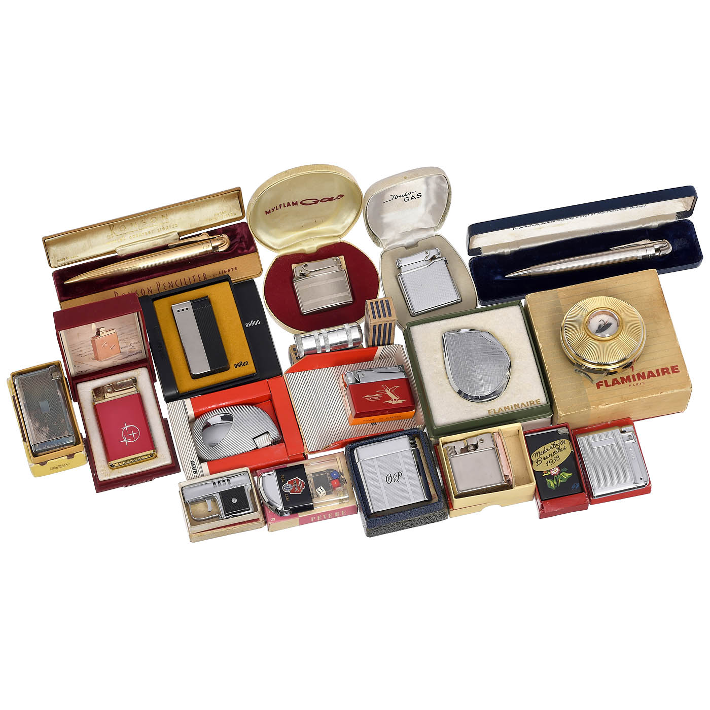 Ronson Peciliter – Pevebe Lighter – 3 x Zilon Meteor (different models) – 2 x Sunflower Cigarette Lighter – Swank Fashion Time (with built-in Swiss watch) – Ronson Penciliter (Rhodium plated) – 2 x Entremets FrancOrusse – But-Luxus F64 (GDR) – Corona (pistol shape) – Olympic ‘Club’ – Silver Match – 2 x Braun ‘Duo’ (Design Dieter Rams) – Tausendzünder (D.R.P.) – Royal Musical Gas Lighter (plays: Smoke gets in your Eyes) – Flaminaire Crillon – Feudor Midget – 5 x Radar Argente (Made in Switzerland) – Flaminaire Paris ‘Club’ – Ronson ‘Pal’, combination with cigarette case – Magna, The Electric Lighter (with built-in torch) – Silver Match, Paris – Ronson ‘Mastercase’, combination with cigarette case – Ferrari Formula – Flaminaire Quercia, Paris – Ronson ‘King’, combination with cigarette case – 12 x Polly-Gaz (different models) – Flaminaire, Paris (with fishing hook under plexiglass) – Ronson Penciliter, 1st version with pencil. – Myflam Gas – Mercedes-Benz Collection – Ronson Varaflame – Silver Match ‘Compound’ – Ibelo Gas – Le Briquet Myon 139 – Feudor – Flamidor and Starlon Gas Lighter.