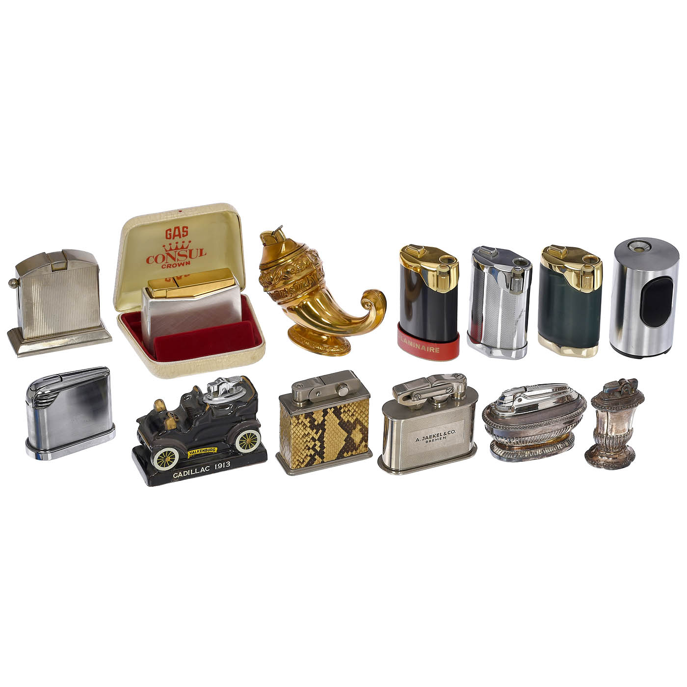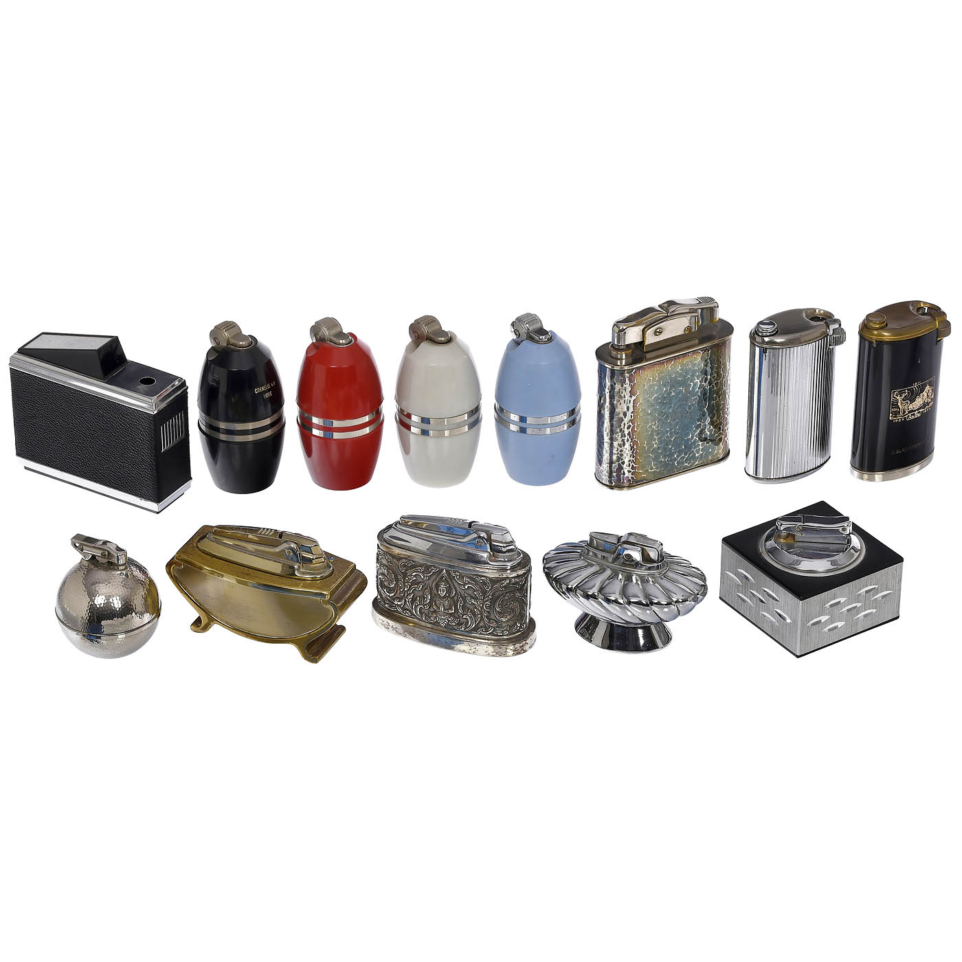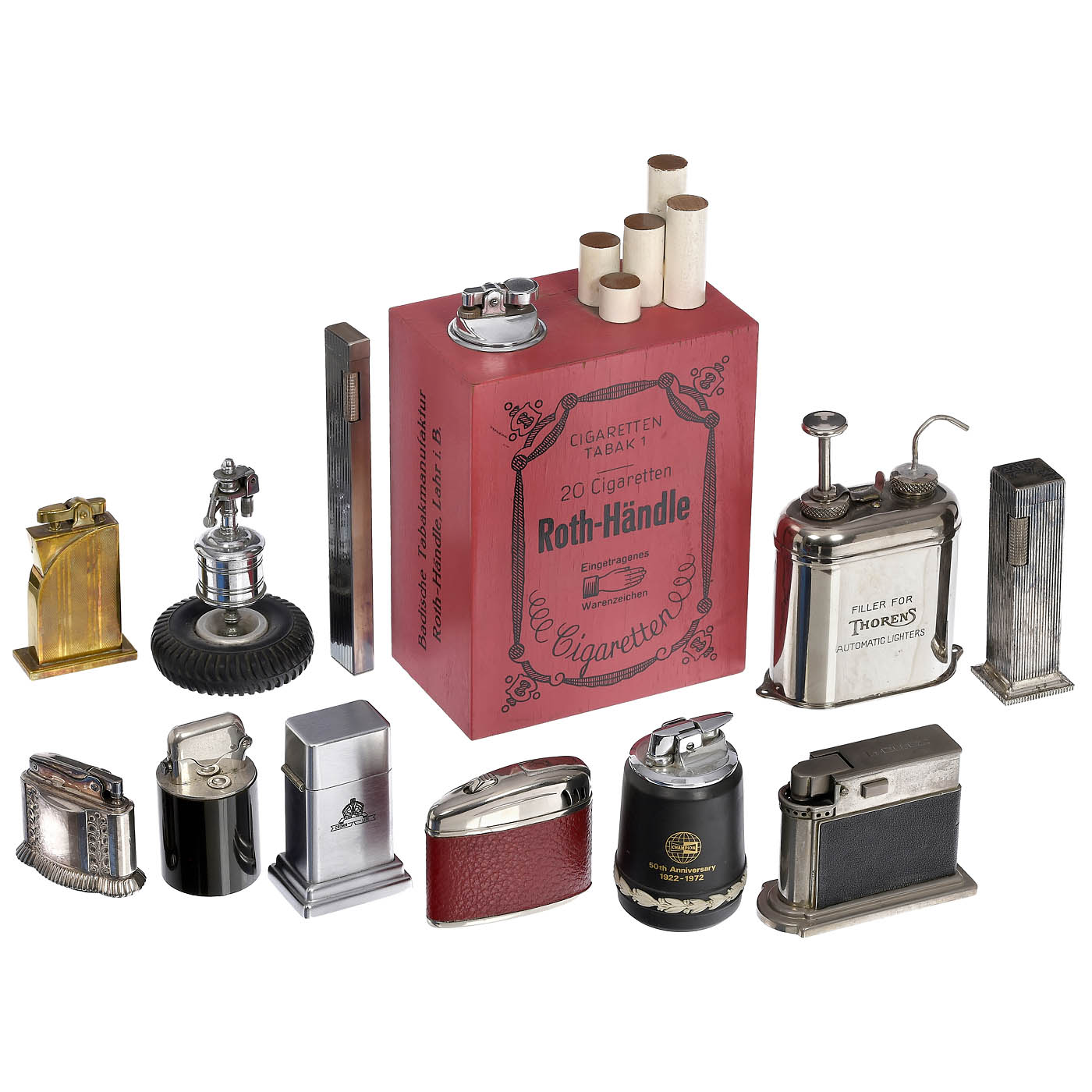 1) Kaschie, Karl Schieder, Nuremberg, gas, nickel-plated. – 2) 4 x Flaminaire Baronet, France, gas, various designs. – 3) Lord De Luxe, gas, silver-plated. – 4) KW – Karl Wieden, petrol, nickel-plated, with advertisement "Ajaco". – 5) Ronson Diana, USA, petrol, silver-plated. – 6) Anglia Mechero, England, petrol, advertising for Dunlop tyres. – 7) Braun T2, petrol, designed by Dieter Rams. – 8) Ronson Varaflame, gas, housing "Made in Siam – Sterling". – 9) Lumet, VEB Metallwarenfabrik Luckenwalde, GDR, petrol. – 10) Ronson Regal, USA, petrol, nickel-plated. – 11) Ronson Mayfair, USA, petrol, nickel-plated. – 12) Rowenta, petrol, with advertising for "Deutz". – 13) Roth-Händle, large advertising display for tobacco shops. – 14) Consul Crown, West Germany, in box. – 15) 4 x Poppel, Holland, gas, various colors. – 16) Rowenta Electronic 2000, gas. – And: 17) 14 other models. – In addition: Refill container for Thorens lighters. – All lighters require cleaning, revision and replacement of the flint or wick.