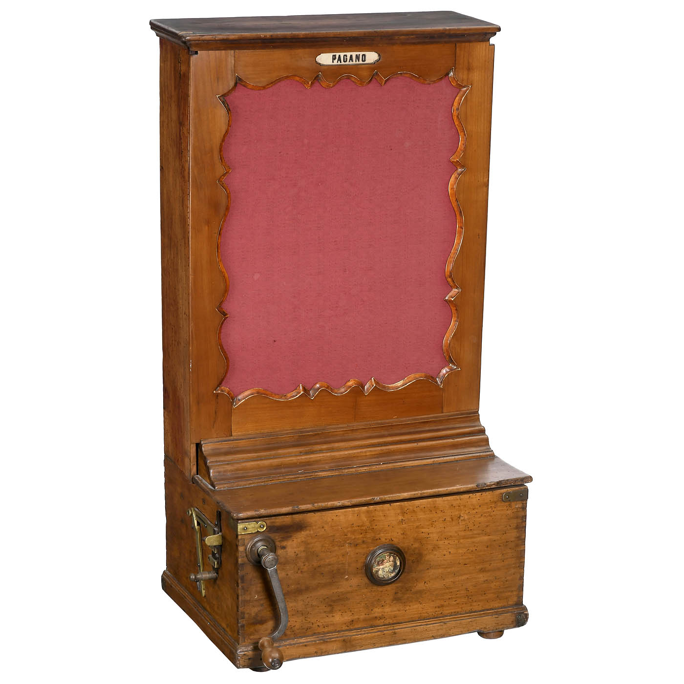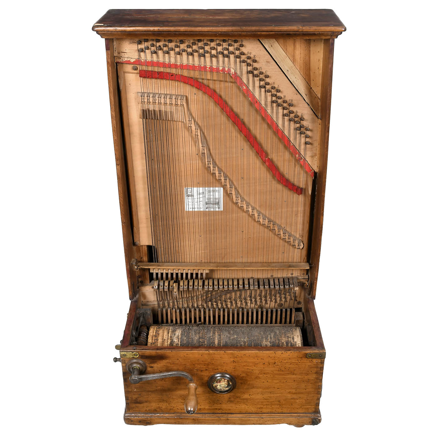 Biagio Marteletti (label on the soundboard), hand-turned mechanism, 29 tone steps, 9 melodies, walnut case (23 3/5 x 17 x 44 in.), works, needs cleaning and tuning.